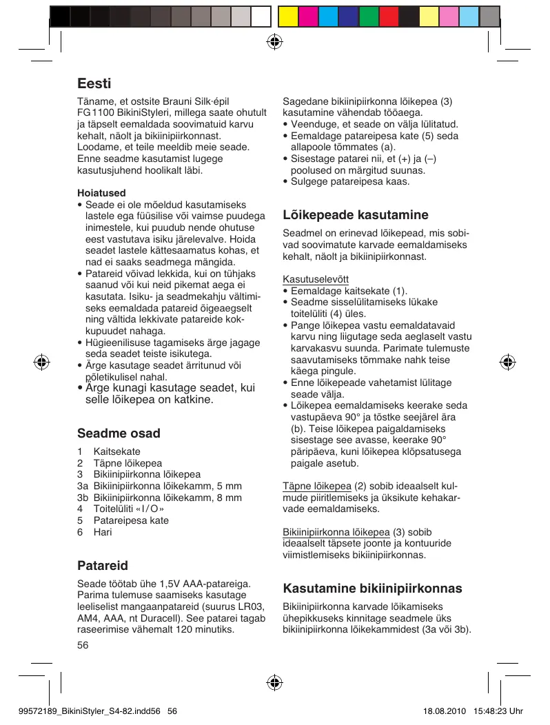 Eesti Täname, et ostsite Brauni Silk-épil FG1100 BikiniStyleri, millega saate ohutult ja täpselt eemaldada soovimatuid karvu kehalt, näolt ja bikinipiirkonnast. Loodame, et teile meeldib meie seade. Enne seadme kasutamist lugege kasutusjuhend hoolikalt läbi. Hoiatused + Seade ei ole môeldud kasutamiseks lastele ega füüsilise vôi vaimse puudega inimestele, kui puudub nende ohutuse eest vastutava isiku järelevalve. Hoida seadet lastele Kättesaamatus kohas, et nad ei saaks seadmega mängida. + Patareid vôivad lekkida, kui on tühjaks saanud vôi kuï neid pikemat aega ei kasutata. Isiku- ja seadmekahju vältimi- seks eemaldada patareid ôigeaegselt ning vältida lekkivate patareide kok- kupuudet nahaga. + Hügieenilisuse tagamiseks ärge jagage seda seadet teiste isikutega. + Ârge kasutage seadet ärritunud vôi pôletikulisel nahal. + Ârge kunagi kasutage seadet, kui selle 16ikepea on katkine. Seadme osad 1 Kaïtsekate 2 Täpne lôikepea 3 Bikinipirkonna lôikepea a Bikinipirkonna lôikekamm, 5 mm 3b Bikinipiirkonna lôikekamm, 8 mm 4 Toitelüliti «1/O» 5 Patareipesa kate 6 Hari Patareid Seade t6ëtab ühe 1,5V AAA-patareiga. Parima tulemuse saamiseks kasutage leeliselist mangaanpatareïd (suurus LRO3, AM4, AAA, nt Duracell). See patarei tagab raseerimise vähemalt 120 minutiks.