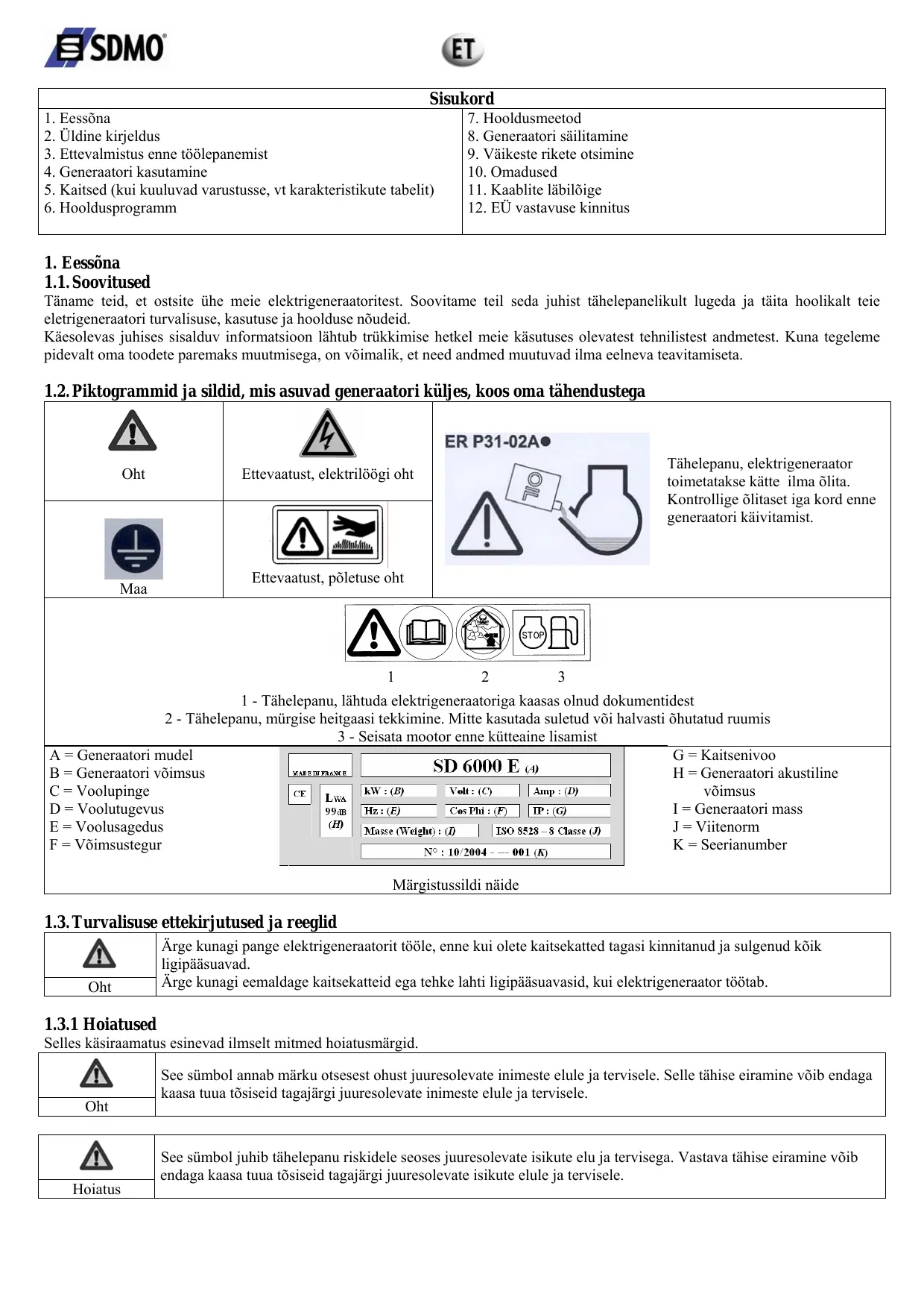 1.1. Soovitused Täname teid, et ostsite ühe meie elektrigeneraatoritest. Soovitame teil seda juhist tähelepanelikult lugeda ja täita hoolikalt teie eletrigeneraatori turvalisuse, kasutuse ja hoolduse nõudeid. Käesolevas juhises sisalduv informatsioon lähtub trükkimise hetkel meie käsutuses olevatest tehnilistest andmetest. Kuna tegeleme pidevalt oma toodete paremaks muutmisega, on võimalik, et need andmed muutuvad ilma eelneva teavitamiseta. 1.2. Piktogrammid ja sildid, mis asuvad generaatori küljes, koos oma tähendustega Oht Maa Tähelepanu, elektrigeneraator toimetatakse kätte ilma õlita. Kontrollige õlitaset iga kord enne generaatori käivitamist. Ettevaatust, elektrilöögi oht Ettevaatust, põletuse oht