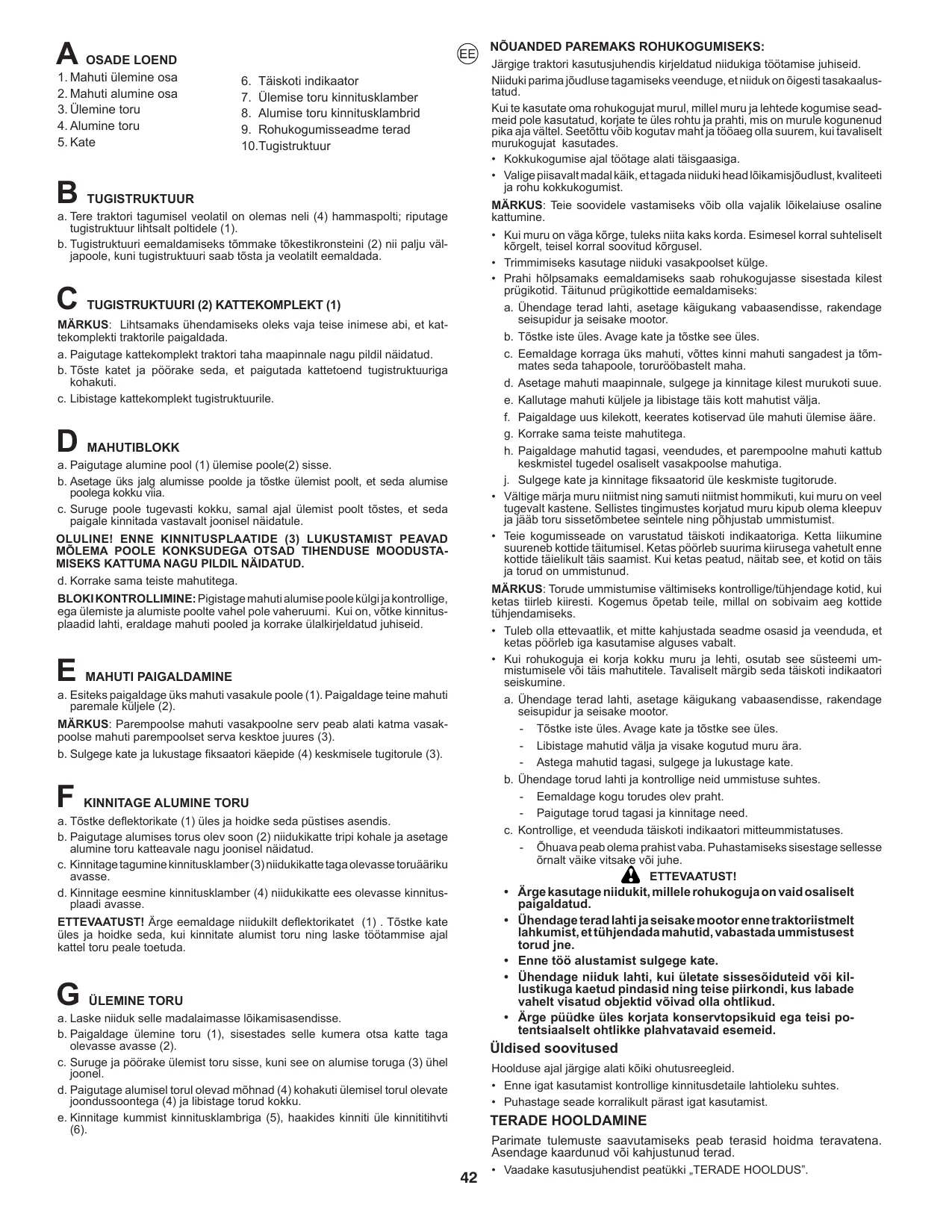 • Nunca haga funcionar la máquina dentro de un área cerrada donde gases peligrosos de óxido de carbono pueden acumularse. • Acuérdese que no hay pendiente segura. Hay que tener mucho cuidado cuando se quiere desplazar sobre pendientes de césped. Para protejerse contra vuelco; - evite arrancar o parar cuando vaya cuesta arriba o cuesta abajo; - enganche el embrague lentamente, siempre guarde la maquina en engranaje, especialmente cuanto se este desplazando cuesta abajo; - las velocidades de la maquina deben ser mantenidas bajas cuando este sobre las pendientes o cuando haga vueltas estrechas. - fíjese si hay agujeros, surcos o otros peligros escondidos; - nunca siegue al través de la cara de la pendiente, a menos que la segadora este diseñada para este propósito. • Tenga mucho cuidado cuando este tirando cargas o cuando este usando un equipo pesado. - Use solamente puntos de enganche de la barra de tracción. - Limite carga a esos que pueda controlar con seguridad. - No haga vuelta rápidas. Tenga cuidado cuando vaya marcha atrás. - Use contrapesos o pesos de rueda cuando este sugerido en su libro de instrucciones. • Tenga un cuidado extra cuando atraviese o se acerque de carreteras . • Pare la rotación de las cuchillas cuando ataviase superficies otras que césped. • Cuando use cualquier accesorio, nunca directa la descarga de materiales hacia personas que estén cerca y no permita que nadie cerca de la maquina cuando esta funcionando. • Nunca use la maquina sin la protección contra la descarga en su sitio • Nunca cambie los ajustes del regulador o no haga que el motor tenga una velocidad excesiva. • Antes de dejar la posición del operador: - desenganche la fuerza motriz y baje los accesorios; - cambie a neutro y enganche el freno de estacionamiento; - pare el motor y remueva la llave. • Desenganche la transmisión a los accesorios, pare el motor, y desconecte el (los) cable (s) de la bujía o remueva la llave de ignición - antes de limpiar bloqueos o desatrancar del conducto; - antes de inspeccionar, limpiar o trabajar sobre la segadora; - después de golpear un objeto extraño. Inspeccione la segadora cuidadosamente, para verificar si hay daños y haga reparaciones antes de volver a arrancar y a operar el equipo; - si la maquina empieza a vibrar anormalmente (verifíquela inmediatamente). • Desenganche la transmisión a los accesorios cuando haga el transporte o cuando no este en uso. • Pare el motor y desenganche la transmisión a los accesorios - antes de agregar combustible; - antes de quitar el recogedor del césped; - antes de haces ajustes de altura a menos que los ajustes pueden ser hechos de la posición del operador. • Reduzca los ajustes de la aceleración durante el tiempo que el motor se apague, si el motor viene diseñado con una válvula de apagado, sierre el combustible cuando halla terminado de segar.