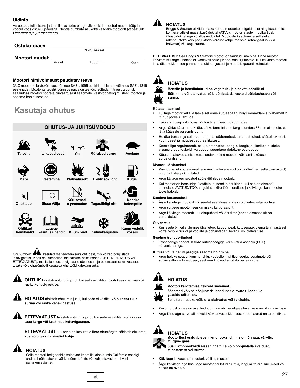 À HOIATUS Briggs & Stratton ei kiida heaks nende mootorite paigaldamist ning kasutamist kolmerattalistel maastikusôidukitel (ATV4), mootorratastel, hobikartidel, ôhusôidukitel ega vôistlussüidukitel. Mootorite kasutamine sellisteks rakendusteks vib pôhjustada varalist kahju, tôsiseid kehavigastusi (k.a halvatus) vôi isegi surmal ETTEVAATUST: See Briggs & Strattoni mootor on tamitud ilma ôlita. Enne mootori Käivitamist lisage kindlasti ôli vastavalt selle juhendi ettekirjutustele. Kui käivitate mootori ilma ôlia, tekitab see parandamatuid kahjustusi ja muudab garanti kehtetuks. HOIATUS Bensiin ja bensiiniaurud on väga tule- ja plahvatusohtlikud. ne vôi plahvatus vôib pôhjustada raskeid pôletushaavu v Kütuse lisamisel + Lülitage mootor välja ja laske sel enne kütusepaagi korgi eemaldamist vähemalt 2 minuti jooksul jahtuda. + Täitke kütusepaaki Gues vôi hästiventileeritud ruumides. + Ârge täitke kütusepaaki üle. Jätke bensiini tase korgist umbes 38 mm allapoole, et iâtia kütusele paisumisruumi. + Hoïdke bensiin ja selle aurud eemal sädemetest, lahtisest tulest, süüteleekidest, kuumusest ja muudest süüteallikatest. + Kontrollige regulaarselt, et kütusetorudes, paagis, korgis ja litmikes ei oleks pragusid ega lekkeïd. Vajadusel asendage defektne osa uuega + Kütuse mahavoolamise korral oodake enne mootori käivitamist kütuse aurustumiseni. Mootori käivitamisel + Veenduge, et süüteküünal, summuti, kütusepaagi kork ja ôhufilter (selle olemasolul) on oma kohal ja kinnitatud. + Ârge käitage eemaldatud süüteküünlaga mootorit. + Kuï mootor on bensiiniga ületäitunud, seadke ôhuklapp (kuï see on olemas) asendisse AVATUD/TOO, seguklapp kire 166 asendisse ja käivitage, kuni mootor tôôle hakkab. Seadme kasutamisel + Ârge kallutage mootorit vôi seadet asendisse, milles vôib kütus välja voolata. + Ârge sulgege mootori seiskamiseks karburaatorit. + Ârge käivitage mootorit, kuï Ghupuhasti vôi ôhufilter (nende olemasolul) on eemaldatud Olivahetus + Kuï lasete ôli välja ülemise ôlitäitetoru kaudu, peab kütusepaak olema tühi, vastasel Korral vôib kütus välja voolata ja pôhjustada tulekahju vi plahvatuse. Seadme transportimisel + Transportige seadet TÜHJA kütusepaagiga vôi suletud asendis (OFF) Kütusekraaniga Kütuse vôi täidetud paagiga seadme hoidmine + Arge hoidke seadet kamina, ahju, veeboileri, lahtise leegiga seadmete vôi süttimisallikate läheduses, sest need vüivad süüdata bensiniaure. HOIATUS Mootori käivitamisel tekivad sädemed. Sädemed vôivad péhjustada läheduses olevate tuleohtlike gaaside süttimise. Selle tulemuseks vôib olla plahvatus vôi tulekahju. + Kuï ümbruskonnas on aset leidnud maa- vôi vedelgaasileke, ärge mootorit käivitage + Ârge kasutage surve all olevaid Käivitusvedelikke, sest nende aurud on tuleohtlikud. À HOIATUS Mootoritest eraldub süsinikmonooksiidi, mis on Iôhnatu, värvitu, mürgine gaas. AN Süsinikmonooksiidi sissehingamine vôib pôhjustada iiveldust, minestamist vôi surma. + Käivitage ja kasutage mootorit välitingimustes. + Ârge käivitage ega kasutage mootorit suletud ruumis, isegi mitte siis, kui uksed vôi aknad on avatud