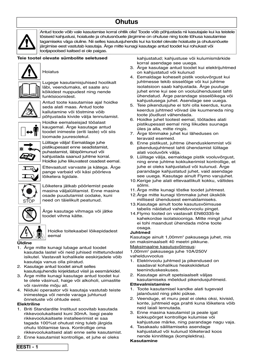 - Предупреждение! Компания Husqvarna Outdoor Products не принимает обязательств по этой гарантии по неисправностям, вызванным в целом или частично, прямо или косвенно, установкой деталей для замены или дополнительных деталей, не изготовленных или не утвержденных компанией Husqvarna Outdoor Products, или по машине, которая была изменена каким-либо способом. РУССКИЙ - 3 Ohutus Antud toode võib vale kasutamise korral ohtlik olla! Toode võib põhjustada nii kasutajale kui ka teistele tõsiseid kahjustusi, hoiatuste ja ohutusnõuete järgimine on ohutuse ning toote tõhusa kasutamise tagamiseks väga oluline. Nii selles kasutusjuhendis kui ka tootel olevate hoiatuste ja ohutusnõuete järgimise eest vastutab kasutaja. Ärge mitte kunagi kasutage antud toodet kui rohukast või tootjapoolsed kaitsed ei ole paigas. Teie tootel olevate sümbolite seletused Hoiatus Lugege kasutamisjuhised hoolikalt läbi, veendumaks, et saate aru kõikidest nuppudest ning nende funktsioonidest. Antud toote kasutamise ajal hoidke seda alati maas. Antud toote kallutamine või tõstmine võib põhjustada kivide välja lennutamist. Hoidke eemalseisjad tööalast kaugemal. Ärge kasutage antud toodet inimeste (eriti laste) või siis loomade juuresolekul. Lülitage välja! Eemaldage juhe pistikupesast enne seadistamist, puhastamist, läbipõimunud või kahjustada saanud juhtme korral. Hoidke juhe liikuvatest osadest eemal. Ettevaatust varvaste ja kätega. Ärge pange varbaid või käsi pöörleva lõiketera ligidale. STOP Lõiketera jätkab pöörlemist peale masina väljalülitamist. Enne masina osade puudutamist oodake, kuni need on täielikult peatunud. Ärge kasutage vihmaga või jätke toodet vihma kätte. Hoidke toitekaabel lõikepidadest eemal Üldine