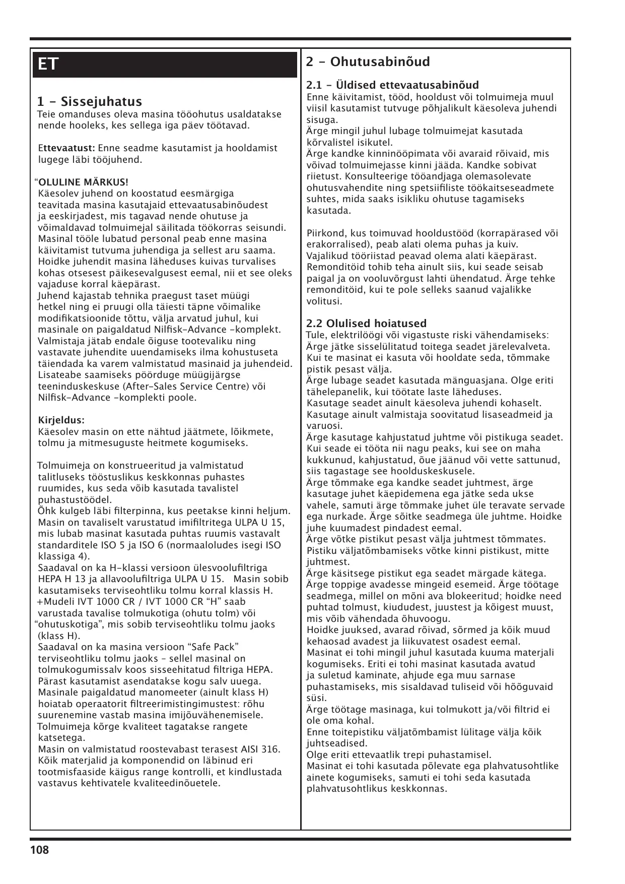 Téléchargez la notice de votre Tööstuslik tolmuimeja au format PDF gratuitement ! Retrouvez votre notice IVT1000CR - NILFISK et reprennez votre appareil électronique en main. Sur cette page sont publiés tous les documents nécessaires à l'utilisation de votre appareil IVT1000CR de la marque NILFISK.