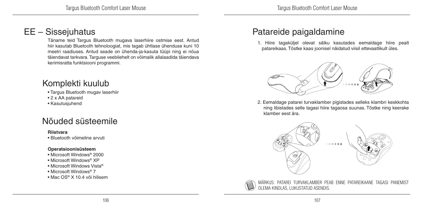 Tõrketuvastus Hiir ei tööta. • Veenduge, et patareide polaarsus on õige. Iga patarei pluss (+) ja miinus (-) ots peab langema kokku patareipesa pluss (+) ja miinus (-) ühendusega. • Veenduge, et patareid on laetud. Vajaduse korral vahetage patareid välja või laadige neid. • Veenduge, et arvuti on Bluetooth võimeline. • Veenduge, et seadme draiverid on installeeritud: 1. Klõpsake Start/ Settings/ Control Panel/ System/ Hardware/ Device Manager 2. Kontrollige jaotisest “Bluetooth Devices”, et “Targus Bluetooth Comfort Laser Mouse” on installeeridu • Paaristatud seadmed on alati ära toodud loendis My Bluetooth Places, seda isegi siis kui hiir on levialast väljas või välja lülitatud.