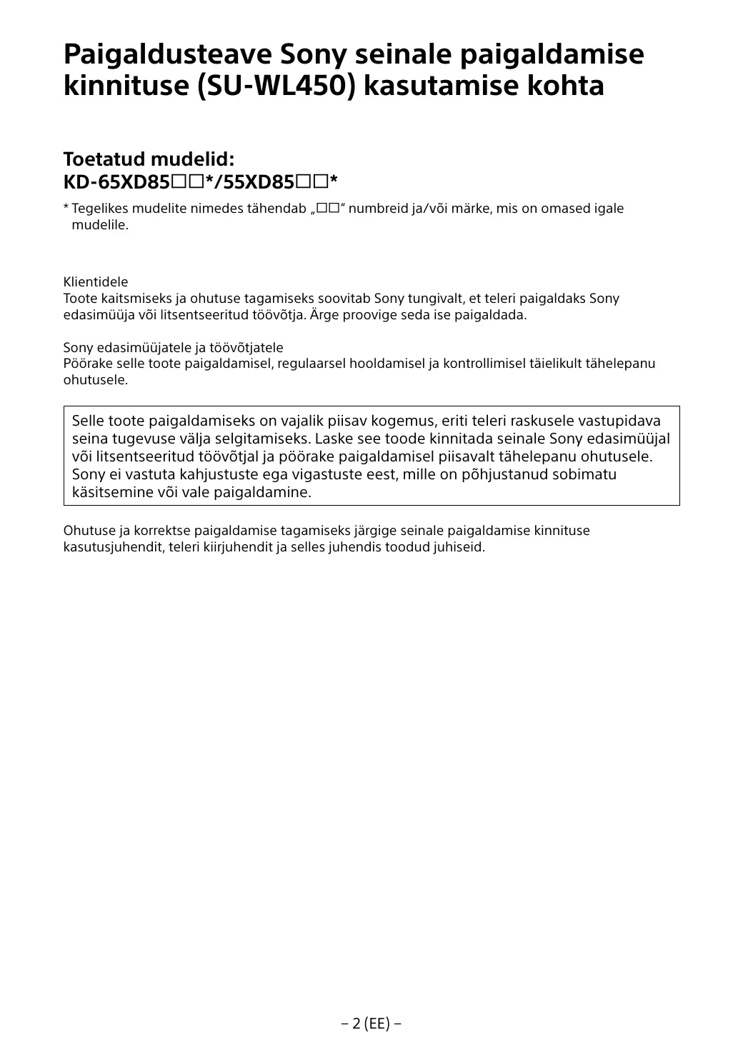 Klientidele Toote kaitsmiseks ja ohutuse tagamiseks soovitab Sony tungivalt, et teleri paigaldaks Sony edasimüüja või litsentseeritud töövõtja. Ärge proovige seda ise paigaldada. Sony edasimüüjatele ja töövõtjatele Pöörake selle toote paigaldamisel, regulaarsel hooldamisel ja kontrollimisel täielikult tähelepanu ohutusele.