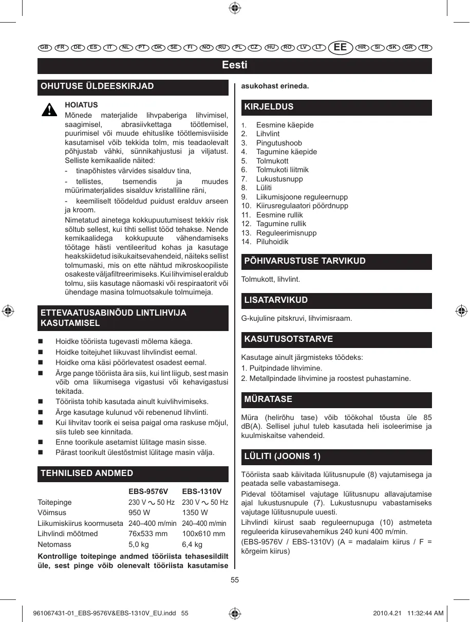 MODE D'EMPLOI EBS9576VFHG RYOBI