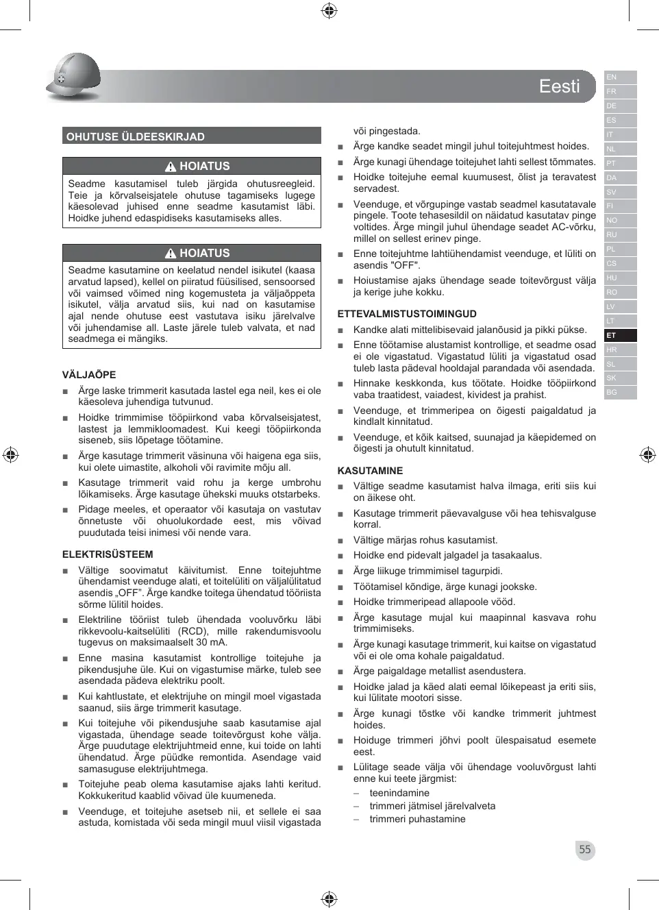 Lülitage seade välja või ühendage vooluvõrgust lahti enne kui teete järgmist: – teenindamine – trimmeri jätmisel järelvalveta – trimmeri puhastamine