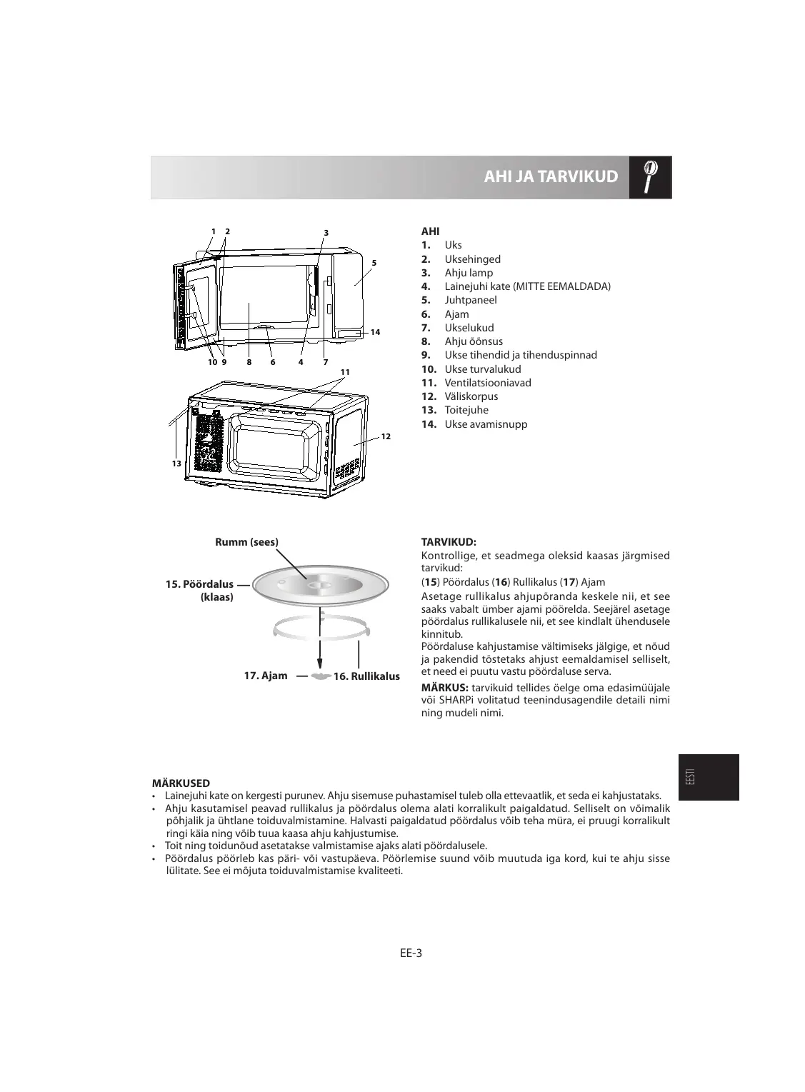 TARVIKUD: Kontrollige, et seadmega oleksid kaasas järgmised tarvikud: (15) Pöördalus (16) Rullikalus (17) Ajam Asetage rullikalus ahjupõranda keskele nii, et see saaks vabalt ümber ajami pöörelda. Seejärel asetage pöördalus rullikalusele nii, et see kindlalt ühendusele kinnitub. Pöördaluse kahjustamise vältimiseks jälgige, et nõud ja pakendid tõstetaks ahjust eemaldamisel selliselt, et need ei puutu vastu pöördaluse serva. MÄRKUS: tarvikuid tellides öelge oma edasimüüjale või SHARPi volitatud teenindusagendile detaili nimi ning mudeli nimi. MÄRKUSED