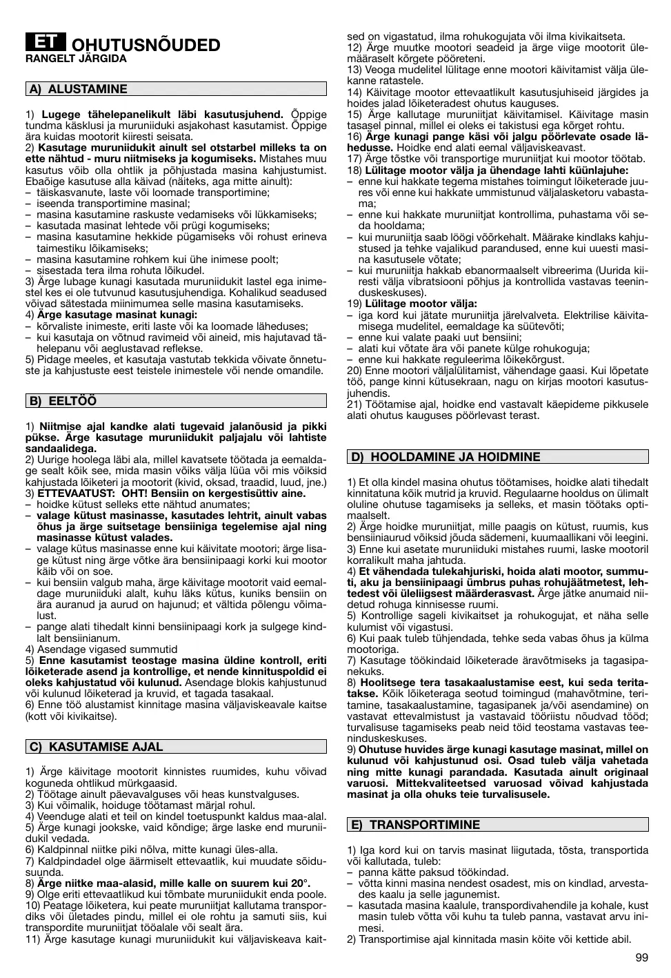 1) Toujours porter des chaussures résistantes et des pantalons longs pendant la tonte. Ne pas utiliser le matériel lorsque l’on est pieds nus ou en sandales. 2) Inspecter minutieusement toute la zone à tondre et éliminer tout objet étranger qui pourrait être projeté par la machine ou endommager l'ensemble de coupe et le moteur (pierres, morceaux de bois, fils de fer, os, etc..). 3) ATTENTION: DANGER! L’essence est hautement inflammable: – conserver le carburant dans des récipients spécialement prévus à cet effet; – faire le plein à l’aide d’un entonnoir, à l’extérieur uniquement et ne pas fumer pendant cette opération ou pendant toute manipulation de carburant; – ajouter de l’essence avant de démarrer le moteur et ne jamais enlever le bouchon du réservoir de carburant ou faire le plein lorsque le moteur est en fonctionnement ou tant qu’il est encore chaud; – ne pas démarrer le moteur si de l’essence a été répandue. Éloigner la tondeuse de la zone où le carburant a été renversé et ne provoquer aucune inflammation tant que le carburant ne s’est pas évaporé et que les vapeurs ne se sont pas dissipées; – remettre et serrer correctement les bouchons du réservoir et du récipient. 4) Remplacer les silencieux d’échappement défectueux. 5) Avant l’utilisation, toujours procéder à une vérification générale et en particulier de l’aspect des lames, des vis de fixation et de l’ensemble de coupe pour s’assurer qu’ils ne sont ni usés ni endommagés. Remplacer les lames et les vis endommagées ou usées par lots complets pour préserver le bon équilibrage. 6) Avant de commencer le travail, monter les protections (sac et déflecteur).
