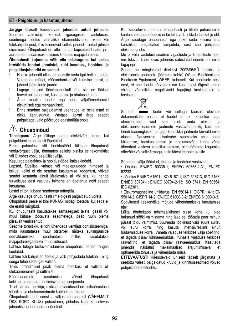 ET - Paigaldus- ja kasutusjuhend Kui käesolevas juhendis õhupuhasti ja filtrite puhastamise kohta sätestatud nõudeid ei täideta, võib tekkida tulekahju oht. Ärge kasutage õhupuhastit ega jätke seda seisma ilma korralikult paigaldatud lampideta, sest see põhjustab elektrilöögi ohu. Me ei võta vastutust seadme vigastuste ja kahjustuste eest, mis tekivad käesolevas juhendis sätestatud nõuete eriramise tagajärjel. Seade on märgistatud direktiivi 2002/96/EÜ (elektri- ja elektroonikaseadmete jäätmete kohta) (Waste Electrical and Electronic Equipment, WEEE) kohaselt. Kui hoolitsete selle eest, et see toode kõrvaldatakse kasutusest õigesti, aitate vältida võimalikke negatiivseid tagajärgi keskkonnale ja tervisele. Järgige täpselt käesolevas juhendis antud juhiseid. Seadme valmistaja keeldub igasugusest vastutusest seadmega seotud võimalike ebameeldivuste, rikete või tulekahjude eest, mis tulenevad selles juhendis antud juhiste eiramisest. Õhupuhasti on ette nähtud küpsetuslõhnade ja aurude eemaldamiseks üksnes koduses majapidamises. Õhupuhasti kujundus võib olla teistsugune kui selles brošüüris toodud joonistel, kuid kasutus-, hooldus- ja paigaldusjuhendid on samad. Hoidke juhendit alles, et saaksite seda igal hetkel uurida. Veenduge müügi, võõrandamise või kolimise korral, et juhend jääks toote juurde. Lugege juhised tähelepanelikult läbi: siin on tähtsat teavet paigaldamise, kasutamise ja ohutuse kohta. Ärge muutke toodet ega selle väljatõmbetorusid elektriliselt ega mehaaniliselt. Enne seadme paigaldamist veenduge, et selle osad ei oleks kahjustunud. Vastasel korral ärge seadet paigaldage, vaid pöörduge edasimüüja poole. Sümbol tootel või sellega kaasas olevates dokumentides näitab, et toodet ei tohi käidelda nagu olmejäätmeid, vaid see tuleb anda elektri- ja elektroonikaseadmete jäätmete vastuvõtupunkti, kust see läheb taasringlusse. Järgige kohalikke jäätmete kõrvaldamise alaseid õigusnorme. Lisateabe saamiseks selle toote käitlemise, taaskasutamise ja ringlussevõtu kohta võtke ühendust vastava kohaliku asutuse, olmejäätmete kogumise ettevõtte või selle firmaga, kelle käest te toote ostsite. Ohuabinõud Tähelepanu! Ärge lülitage seadet elektrivõrku enne, kui paigaldamine on täiesti lõpetatud. Enne puhastus- või hooldustööd lülitage õhupuhasti vooluvõrgust välja, tõmmates selleks pistiku seinakontaktist või lülitades voolu pealülitist välja. Kasutage paigaldus- ja hooldustöödel kaitsekindaid. Lapsed, füüsilise, vaimse või meelepuudega inimesed ja isikud, kellel ei ole seadme kasutamise kogemust, võivad seadet kasutada ainult järelevalve all või siis, kui nende turvalisuse eest vastutav inimene on õpetanud neid seadet kasutama. Lastel ei tohi lubada seadmega mängida. Ärge kasutage õhupuhastit ilma õigesti paigaldatud võreta. Õhupuhasti peale ei tohi KUNAGI midagi toetada, kui seda ei ole eraldi märgitud. Kui õhupuhastit kasutatakse samaaegselt teiste, gaasil või muul kütusel töötavate seadmetega, peab ruum olema piisavalt ventileeritud. Seadme torustikku ei tohi ühendada ventilatsioonisüsteemiga, mida kasutatakse muul otstarbel, näiteks suitsugaaside eemaldamiseks seadmetest, milles kasutatakse majapidamisgaasi või muid kütuseid. Lahtise tulega toiduvalmistamine õhupuhasti all on rangelt keelatud. Lahtine tuli kahjustab filtreid ja võib põhjustada tulekahju ning seega tuleb seda igati vältida. Toidu praadimisel peab olema hoolikas, et vältida õli ülekuumenemist ja süttimist. Köögiseadmete kasutamisel võivad õhupuhasti kokkupuutepinnad märkimisväärselt soojeneda. Tuleb järgida eeskirju, mida ametiasutused on suitsuärastuse tehniliste ja ohutusmeetmete kohta kehtestanud. Õhupuhastit peab seest ja väljast regulaarselt (VÄHEMALT ÜKS KORD KUUS) puhastama, pidades kinni käesolevas juhendis toodud hooldusnõuetest. Seade on välja töötatud, testitud ja toodetud vastavalt:
