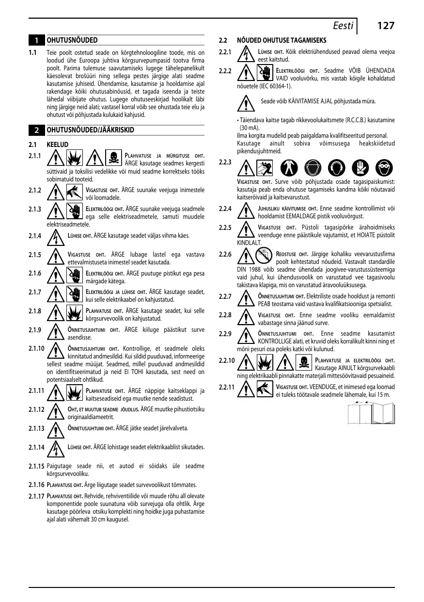 4.1 Vérifier qu’elles soient toujours présentes et lisibles ; dans le cas contraire, les remplacer en les appliquant dans la position d’origine. Icône E1 – Elle indique l’obligation de ne pas éliminer l’appareil comme déchet urbain ; il peut être redonné au distributeur au moment de l’achat d’un appareil neuf. Les parties électriques et électroniques de l’appareil ne doivent pas être réutilisées pour usages impropres car elles contiennent des substances dangereuses pour la santé. Icône E2 – Elle indique que l’appareil est conçu pour un usage professionnel, c’est-à-dire pour les personnes qui ont de l’expérience, une connaissance technique, normative, législative et qui sont en mesure d’exécuter les opérations nécessaires à l’utilisation et l’entretien de l’appareil. Icône E3 – Elle indique que l’appareil est conçu pour une usage non professionnel (domestique).