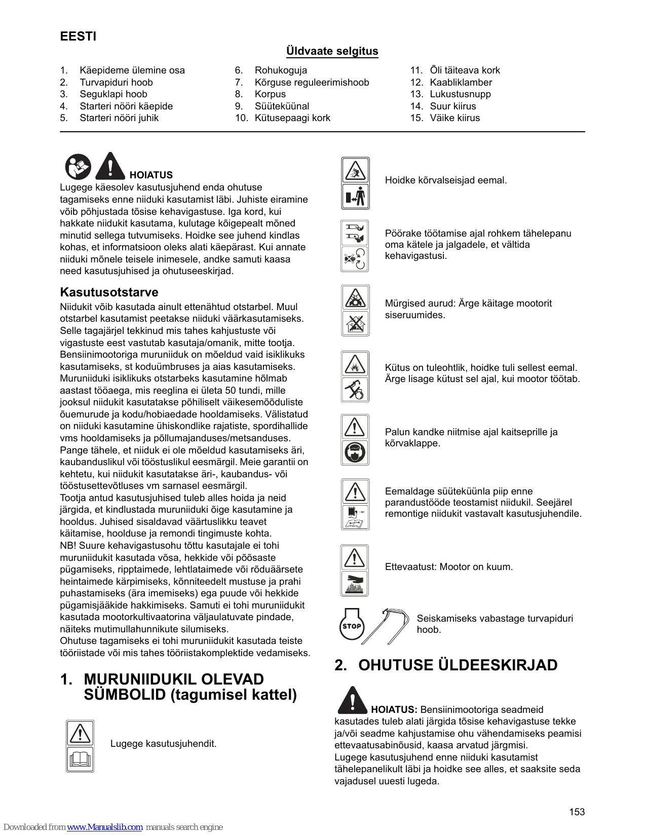 2. OHUTUSE ÜLDEESKIRJAD HOIATUS: Bensiinimootoriga seadmeid kasutades tuleb alati järgida tõsise kehavigastuse tekke ja/või seadme kahjustamise ohu vähendamiseks peamisi ettevaatusabinõusid, kaasa arvatud järgmisi. Lugege kasutusjuhend enne niiduki kasutamist tähelepanelikult läbi ja hoidke see alles, et saaksite seda vajadusel uuesti lugeda. 153