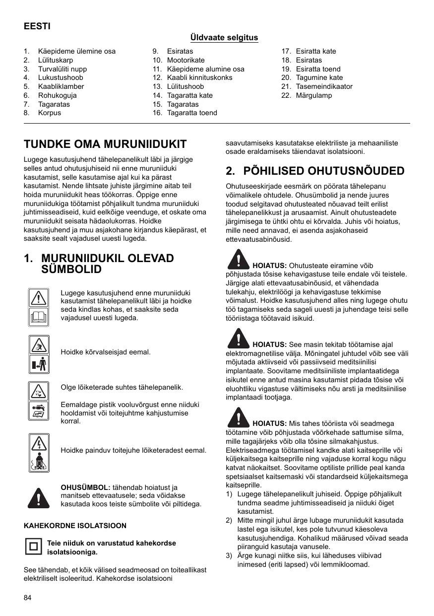 OHUSÜMBOL: tähendab hoiatust ja manitseb ettevaatusele; seda võidakse kasutada koos teiste sümbolite või piltidega. KAHEKORDNE ISOLATSIOON Teie niiduk on varustatud kahekordse isolatsiooniga. See tähendab, et kõik välised seadmeosad on toiteallikast elektriliselt isoleeritud. Kahekordse isolatsiooni 84