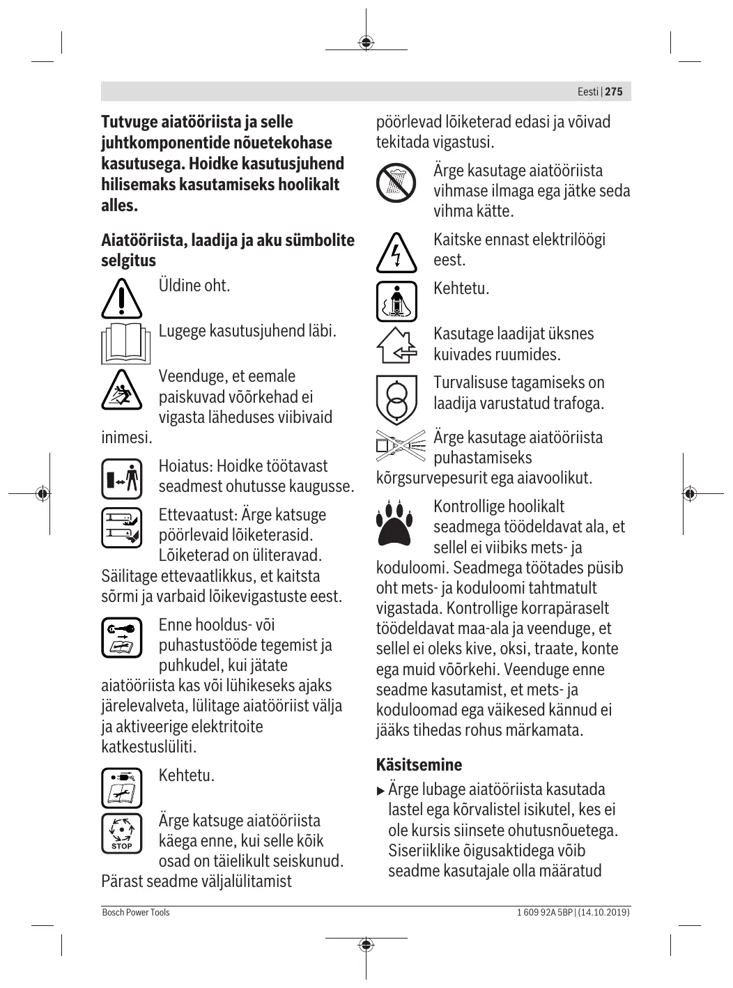 Eesti Ohutusnõuded Tähelepanu! Lugege järgmised juhised tähelepanelikult läbi. Bosch Power Tools