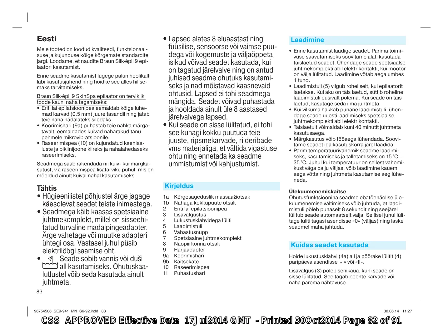 CSS APPROVED Effective Date 17Jul2014 GMT - Printed 30Oct2014 Page 81 of 91 Eesti Meie tooted on loodud kvaliteedi, funktsionaalsuse ja kujunduse kõige kõrgemate standardite järgi. Loodame, et naudite Braun Silk·épil 9 epilaatori kasutamist. Enne seadme kasutamist lugege palun hoolikalt läbi kasutusjuhend ning hoidke see alles hilisemaks tarvitamiseks. Braun Silk·épil 9 SkinSpa epilaator on terviklik toode kauni naha tagamiseks: