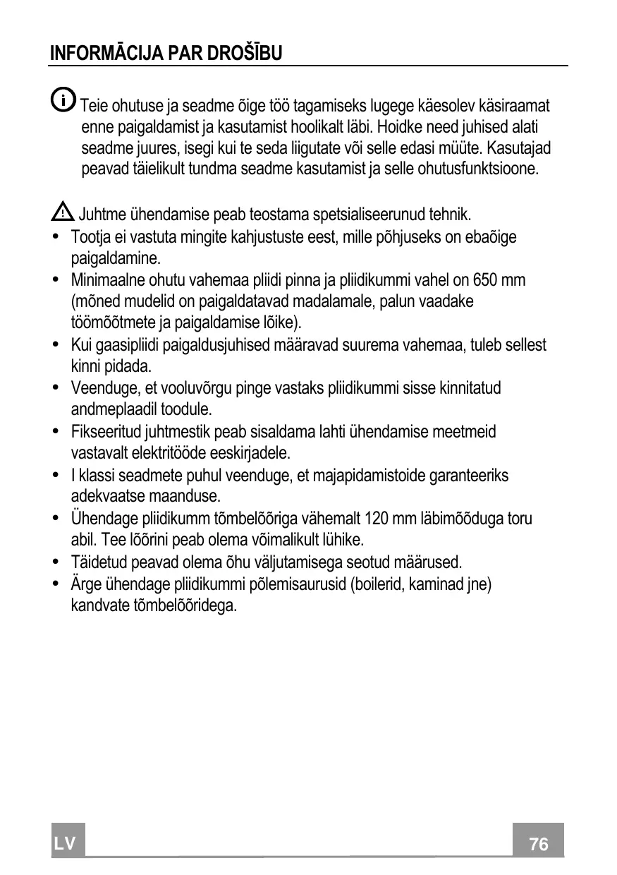 Juhtme ühendamise peab teostama spetsialiseerunud tehnik. Tootja ei vastuta mingite kahjustuste eest, mille põhjuseks on ebaõige paigaldamine. Minimaalne ohutu vahemaa pliidi pinna ja pliidikummi vahel on 650 mm (mõned mudelid on paigaldatavad madalamale, palun vaadake töömõõtmete ja paigaldamise lõike). Kui gaasipliidi paigaldusjuhised määravad suurema vahemaa, tuleb sellest kinni pidada. Veenduge, et vooluvõrgu pinge vastaks pliidikummi sisse kinnitatud andmeplaadil toodule. Fikseeritud juhtmestik peab sisaldama lahti ühendamise meetmeid vastavalt elektritööde eeskirjadele. I klassi seadmete puhul veenduge, et majapidamistoide garanteeriks adekvaatse maanduse. Ühendage pliidikumm tõmbelõõriga vähemalt 120 mm läbimõõduga toru abil. Tee lõõrini peab olema võimalikult lühike. Täidetud peavad olema õhu väljutamisega seotud määrused. Ärge ühendage pliidikummi põlemisaurusid (boilerid, kaminad jne) kandvate tõmbelõõridega.
