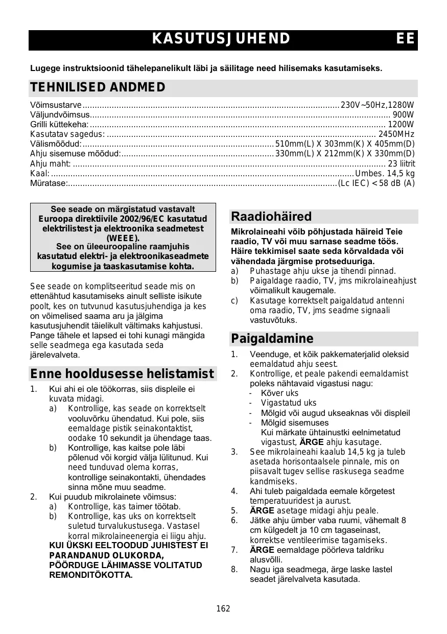 Lugege instruktsioonid tähelepanelikult läbi ja säilitage need hilisemaks kasutamiseks. TEHNILISED ANDMED Võimsustarve .......................................................................................................... 230V~50Hz,1280W Väljundvõimsus............................................................................................................................ 900W Grilli küttekeha: .......................................................................................................................... 1200W Kasutatav sagedus: ............................................................................................................... 2450MHz Välismõõdud: ............................................................................... 510mm(L) X 303mm(K) X 405mm(D) Ahju sisemuse mõõdud: ............................................................... 330mm(L) X 212mm(K) X 330mm(D) Ahju maht: ................................................................................................................................. 23 liitrit Kaal: ............................................................................................................................. Umbes. 14,5 kg Müratase:............................................................................................................... (Lc IEC) < 58 dB (A) See seade on märgistatud vastavalt Euroopa direktiivile 2002/96/EC kasutatud elektrilistest ja elektroonika seadmetest (WEEE). See on üleeuroopaline raamjuhis kasutatud elektri- ja elektroonikaseadmete kogumise ja taaskasutamise kohta. Raadiohäired Mikrolaineahi võib põhjustada häireid Teie raadio, TV või muu sarnase seadme töös. Häire tekkimisel saate seda kõrvaldada või vähendada järgmise protseduuriga. a) Puhastage ahju ukse ja tihendi pinnad. b) Paigaldage raadio, TV, jms mikrolaineahjust võimalikult kaugemale. c) Kasutage korrektselt paigaldatud antenni oma raadio, TV, jms seadme signaali vastuvõtuks. See seade on komplitseeritud seade mis on ettenähtud kasutamiseks ainult selliste isikute poolt, kes on tutvunud kasutusjuhendiga ja kes on võimelised saama aru ja jälgima kasutusjuhendit täielikult vältimaks kahjustusi. Pange tähele et lapsed ei tohi kunagi mängida selle seadmega ega kasutada seda järelevalveta. Paigaldamine