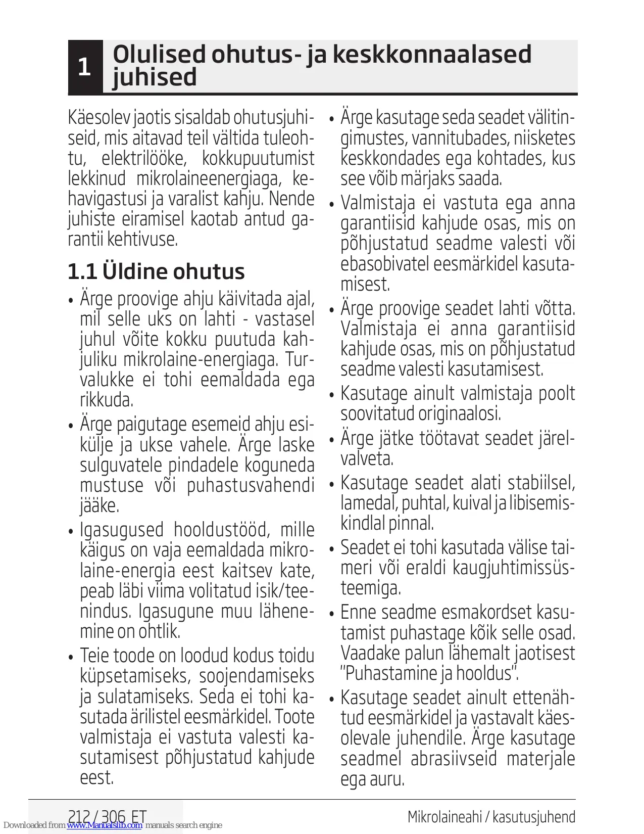 211 / 306 ET Olulised ohutus- ja keskkonnaalased 1 juhised Käesolev jaotis sisaldab ohutusjuhiseid, mis aitavad teil vältida tuleohtu, elektrilööke, kokkupuutumist lekkinud mikrolaineenergiaga, kehavigastusi ja varalist kahju. Nende juhiste eiramisel kaotab antud garantii kehtivuse.