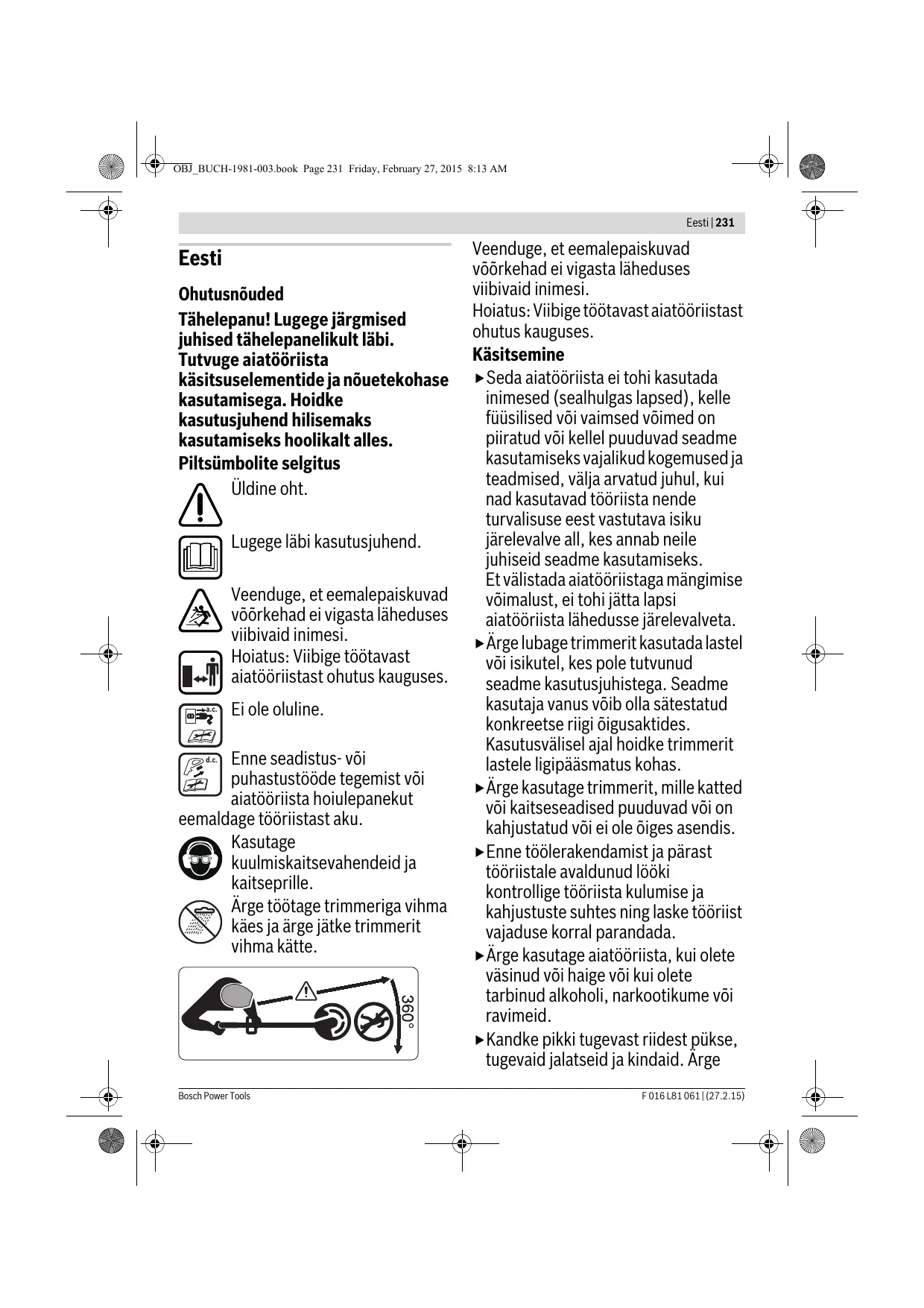 Proces punjenja počinje čim se mrežni utikač punjača utakne u utičnicu i aku-baterija nakon toga umetne u punjač . Inteligentnim postupcima punjenja se automatski prepoznaje stanje napunjenosti aku-baterije i ovisno od temperature akubaterije i napona, puni se sa optimalnom strujom punjenja. Na taj se način čuva aku-baterija i ostaje uvijek potpuno napunjena kod spremanja u punjaču. Napomena: Proces punjenja je moguć samo ako se temperatura aku-baterije nalazi u dopuštenom temperaturnom području punjenja, vidjeti poglavlje „Tehnički podaci“. Puštanje u rad Za vašu sigurnost Pažnja: Prije izvođenja radova podešavanja ili čišćenja isključite vrtni uređaj i izvadite aku-bateriju. Nakon isključivanja aku-šišača tratine, nož se okreće još nekoliko sekundi. Treba pričekati da se motor/nož zaustavi prije ponovnog uključivanja. Uređaj ne isključivati i uključivati uzastopno na kratko. Preporučuje se primjena od Bosch odobrenih reznih elemenata. S nekim drugim reznim elementima neće se postići očekivani rezultat rezanja. Punjenje aku-baterije Ne koristite neki drugi punjač. Isporučeni punjač je prilagođen je Li-ionskim aku-baterijama ugrađenim u vrtnom uređaju. Bosch Power Tools Treperavo svjetlo pokazivača punjenja akubaterije Proces punjenja se signalizira treperenjem pokazivača punjenja aku-baterije . Stalno svjetlo pokazivača punjenja aku-baterije Stalno svjetlo pokazivača punjenja aku-baterije signalizira da je akubaterija potpuno napunjena ili da je temperatura aku-baterije izvan dopuštenog područja temperature punjenja i zbog toga se ne može napuniti. Čim se dosegne dopušteno područje temperature, aku-baterija će se napuniti. Bez utaknute aku-baterije, stalno svjetlo pokazivača punjenja aku-baterije signalizira da je mrežni utikač utaknut i da je punjač pripravan za rad. F 016 L81 061 | (27.2.15) OBJ_BUCH-1981-003.book Page 230 Friday, February 27, 2015 8:13 AM 230 | Hrvatski Napomene uz punjenje Kod kontinuiranih, odnosno višekratno uzastopnih ciklusa punjenja bez prekida, punjač bi se mogao zagrijati. To nije štetno i ne ukazuje na tehničku neispravnost punjača. Bitno skraćenje vremena rada nakon punjenja pokazuje da je aku-baterija istrošena i da je treba zamijeniti. Traženje greške d.c. Simptomi Mogući uzroci Pomoć Štitnik se ne može povući preko Pogrešna montaža tanjurastog reznog diska Uklanjanje reznog diska i ponovna montaža štitnika Šišač tratine ne radi Ispražnjena aku-baterija Napuniti aku-bateriju. Vidjeti i upute za punjenje Aku-baterija je suviše hladna/suviše topla Zagrijati aku-bateriju/ostaviti da se ohladi Neispravno unutarnje ožičenje vrtnog uređaja Zatražiti pomoć ovlaštenog servisa Šišač tratine radi sa prekidima Neispravan prekidač za uključivanje/isključivanje Zatražiti pomoć ovlaštenog servisa Vrtni uređaj je preopterećen Previsoka trava Rezati u stupnjevima Vrtni uređaj ne reže Nož je oštećen Zamjena noža Pojačane vibracije Nož je oštećen Zamjena noža Servisiranje i savjetovanje o primjeni Zbrinjavanje www.bosch-garden.com Kod svih upita i naručivanja rezervnih dijelova molimo neizostavno navedite 10-znamenkasti kataloški broj sa tipske pločice vrtnog uređaja. Vrtne uređaje, punjače i aku-bateriju/baterije ne bacajte u kućni otpad! Samo za zemlje EU: Prema Europskim smjernicama 2012/19/EU, neuporabivi električni i elektronički uređaji i prema Smjernicama 2006/66/EC neispravne ili istrošene aku-baterije/baterije moraju se odvojeno sakupljati i dovesti na ekološki prihvatljivo recikliranje. Aku-baterije/baterije: Li-Ion: Molimo pridržavajte se napomena u odjeljku „Transport“. Hrvatski Robert Bosch d.o.o Kneza Branimira 22 10040 Zagreb Tel.: (01) 2958051 Fax: (01) 2958050 Transport Li-ionske aku-baterije ugrađene u električnom alatu podliježu zakonu o transportu opasnih tvari. Aku-baterije korisnik može bez ikakvih preduvjeta transportirati cestovnim transportom. Ako transport obavlja treća strana (npr. transport zrakoplovom ili špedicijom), treba se pridržavati posebnih zahtjeva obzirom na ambalažu i označavanje. Kod pripreme ovakvih pošiljki za transport prethodno se treba savjetovati sa stručnjakom za transport opasnih tvari. Zadržavamo pravo na promjene. Aku-bateriju šaljite nekim transportnim sredstvom samo ako je njeno kućište neoštećeno. Oblijepite otvorene kontakte i zapakirajte aku-bateriju tako da se ne može pomicati u ambalaži. Molimo pridržavajte se i eventualnih dodatnih nacionalnih propisa. F 016 L81 061 | (27.2.15) Bosch Power Tools OBJ_BUCH-1981-003.book Page 231 Friday, February 27, 2015 8:13 AM Eesti | 231 Eesti Ohutusnõuded Tähelepanu! Lugege järgmised juhised tähelepanelikult läbi. Tutvuge aiatööriista käsitsuselementide ja nõuetekohase kasutamisega. Hoidke kasutusjuhend hilisemaks kasutamiseks hoolikalt alles. Piltsümbolite selgitus Üldine oht. Lugege läbi kasutusjuhend. Veenduge, et eemalepaiskuvad võõrkehad ei vigasta läheduses viibivaid inimesi. Hoiatus: Viibige töötavast aiatööriistast ohutus kauguses. a.c. Ei ole oluline. Enne seadistus- või puhastustööde tegemist või aiatööriista hoiulepanekut eemaldage tööriistast aku. Kasutage kuulmiskaitsevahendeid ja kaitseprille. Ärge töötage trimmeriga vihma käes ja ärge jätke trimmerit vihma kätte. d.c. Bosch Power Tools Veenduge, et eemalepaiskuvad võõrkehad ei vigasta läheduses viibivaid inimesi. Hoiatus: Viibige töötavast aiatööriistast ohutus kauguses. Käsitsemine Seda aiatööriista ei tohi kasutada inimesed (sealhulgas lapsed), kelle füüsilised või vaimsed võimed on piiratud või kellel puuduvad seadme kasutamiseks vajalikud kogemused ja teadmised, välja arvatud juhul, kui nad kasutavad tööriista nende turvalisuse eest vastutava isiku järelevalve all, kes annab neile juhiseid seadme kasutamiseks. Et välistada aiatööriistaga mängimise võimalust, ei tohi jätta lapsi aiatööriista läheduss