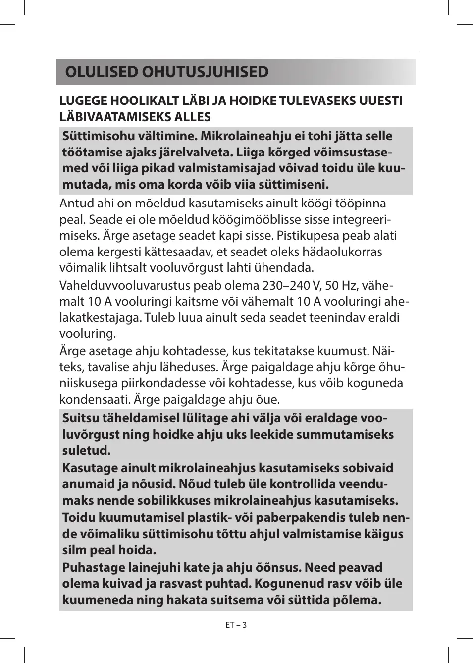 Süttimisohu vältimine. Mikrolaineahju ei tohi jätta selle töötamise ajaks järelvalveta. Liiga kõrged võimsustasemed või liiga pikad valmistamisajad võivad toidu üle kuumutada, mis oma korda võib viia süttimiseni. Antud ahi on mõeldud kasutamiseks ainult köögi tööpinna peal. Seade ei ole mõeldud köögimööblisse sisse integreerimiseks. Ärge asetage seadet kapi sisse. Pistikupesa peab alati olema kergesti kättesaadav, et seadet oleks hädaolukorras võimalik lihtsalt vooluvõrgust lahti ühendada. Vahelduvvooluvarustus peab olema 230–240 V, 50 Hz, vähemalt 10 A vooluringi kaitsme või vähemalt 10 A vooluringi ahelakatkestajaga. Tuleb luua ainult seda seadet teenindav eraldi vooluring. Ärge asetage ahju kohtadesse, kus tekitatakse kuumust. Näiteks, tavalise ahju läheduses. Ärge paigaldage ahju kõrge õhuniiskusega piirkondadesse või kohtadesse, kus võib koguneda kondensaati. Ärge paigaldage ahju õue. Suitsu täheldamisel lülitage ahi välja või eraldage vooluvõrgust ning hoidke ahju uks leekide summutamiseks suletud. Kasutage ainult mikrolaineahjus kasutamiseks sobivaid anumaid ja nõusid. Nõud tuleb üle kontrollida veendumaks nende sobilikkuses mikrolaineahjus kasutamiseks. Toidu kuumutamisel plastik- või paberpakendis tuleb nende võimaliku süttimisohu tõttu ahjul valmistamise käigus silm peal hoida. Puhastage lainejuhi kate ja ahju õõnsus. Need peavad olema kuivad ja rasvast puhtad. Kogunenud rasv võib üle kuumeneda ning hakata suitsema või süttida põlema. ET – 3