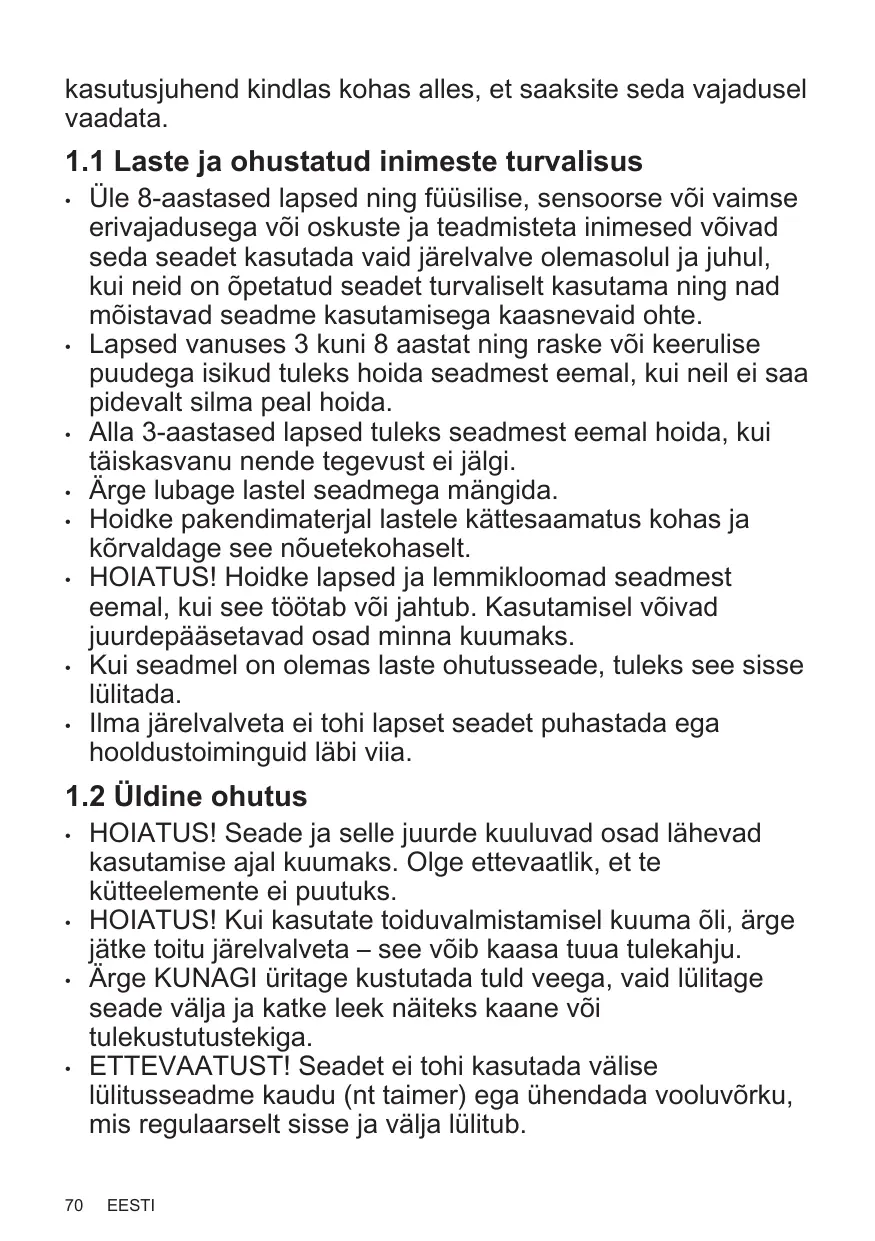 HOIATUS! Seade ja selle juurde kuuluvad osad lähevad kasutamise ajal kuumaks. Olge ettevaatlik, et te kütteelemente ei puutuks. HOIATUS! Kui kasutate toiduvalmistamisel kuuma õli, ärge jätke toitu järelvalveta – see võib kaasa tuua tulekahju. Ärge KUNAGI üritage kustutada tuld veega, vaid lülitage seade välja ja katke leek näiteks kaane või tulekustutustekiga. ETTEVAATUST! Seadet ei tohi kasutada välise lülitusseadme kaudu (nt taimer) ega ühendada vooluvõrku, mis regulaarselt sisse ja välja lülitub. EESTI