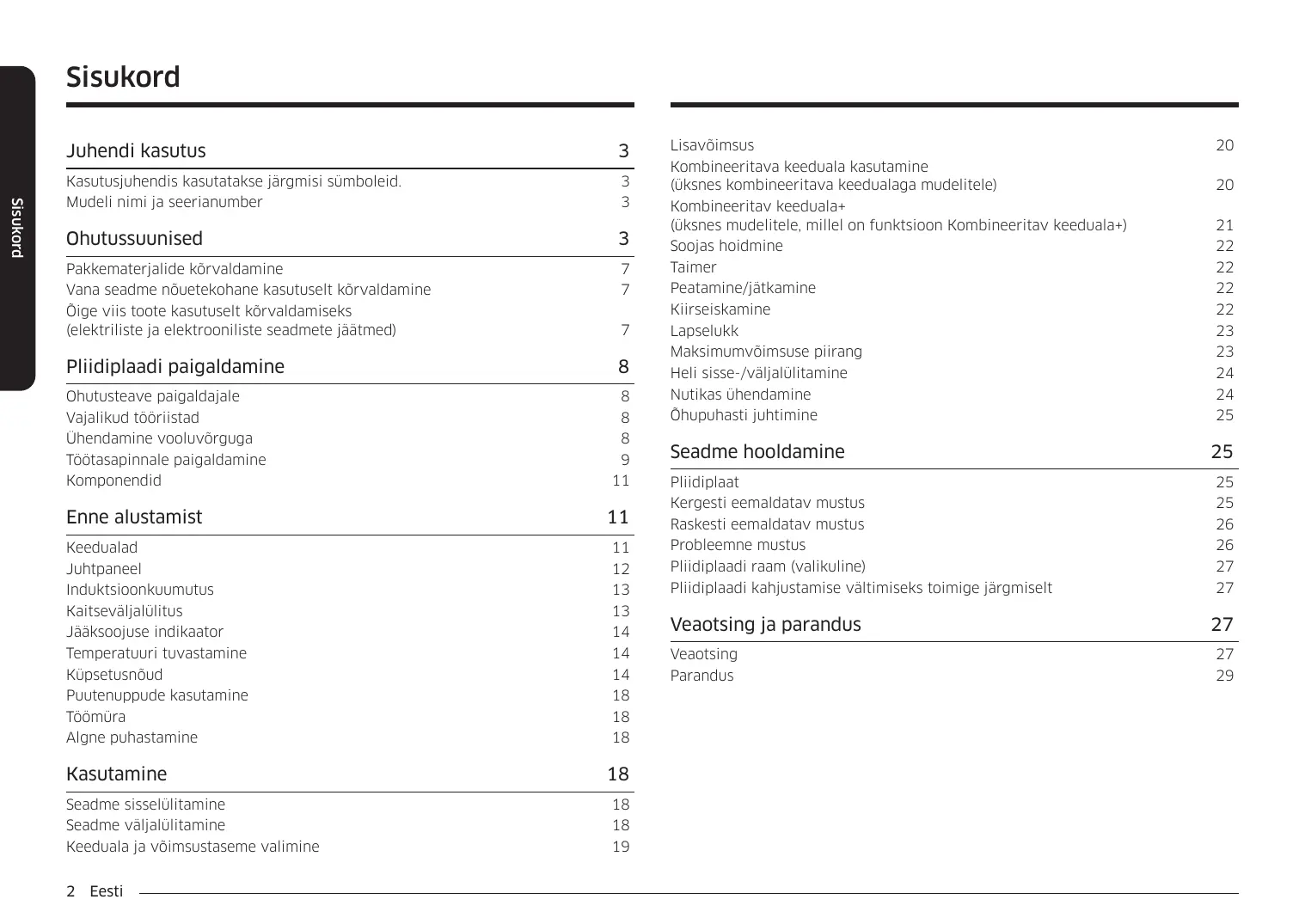 Enne alustamist Keedualad Juhtpaneel Induktsioonkuumutus Kaitseväljalülitus Jääksoojuse indikaator Temperatuuri tuvastamine Küpsetusnõud Puutenuppude kasutamine Töömüra Algne puhastamine