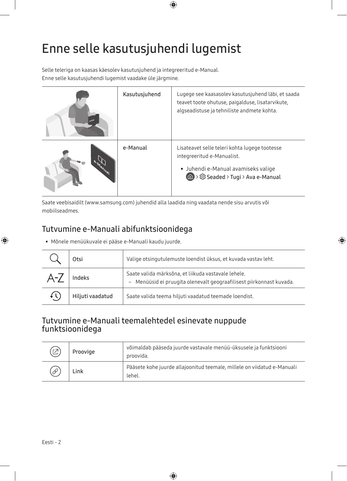 Enne selle kasutusjuhendi lugemist Selle teleriga on kaasas käesolev kasutusjuhend ja integreeritud e-Manual. Enne selle kasutusjuhendi lugemist vaadake üle järgmine.