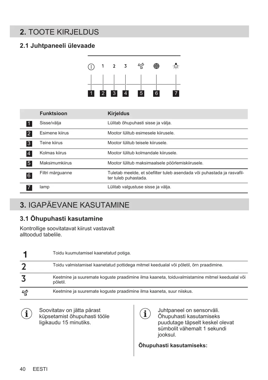 1. Lülitage seade sisse, vajutades sümbolit . Nüüd saate funktsioonid sisse lülitada. 2. Funktsiooni käivitamiseks puudutage sümbolit. Õhupuhasti valgusti on teistest funktsioonidest sõltumatu. Keeduala valgustamiseks puudutage