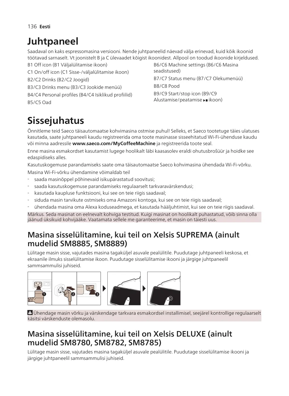 Sissejuhatus Õnnitleme teid Saeco täisautomaatse kohvimasina ostmise puhul! Selleks, et Saeco tootetuge täies ulatuses kasutada, saate juhtpaneeli kaudu registreerida oma toote masinasse sisseehitatud Wi-Fi-ühenduse kaudu või minna aadressile www.saeco.com/MyCoffeeMachine ja registreerida toote seal. Enne masina esmakordset kasutamist lugege hoolikalt läbi kaasasolev eraldi ohutusbrošüür ja hoidke see edaspidiseks alles. Kasutuskogemuse parandamiseks saate oma täisautomaatse Saeco kohvimasina ühendada Wi-Fi-võrku. Masina Wi-Fi-võrku ühendamine võimaldab teil - saada masinõppel põhinevaid isikupärastatud soovitusi; - saada kasutuskogemuse parandamiseks regulaarselt tarkvaravärskendusi; - kasutada kaupluse funktsiooni, kui see on teie riigis saadaval; - siduda masin tarvikute ostmiseks oma Amazoni kontoga, kui see on teie riigis saadaval; - ühendada masina oma Alexa koduseadmega, et kasutada hääljuhtimist, kui see on teie riigis saadaval. Märkus. Seda masinat on eelnevalt kohviga testitud. Kuigi masinat on hoolikalt puhastatud, võib sinna olla jäänud üksikuid kohvijääke. Vaatamata sellele me garanteerime, et masin on täiesti uus.