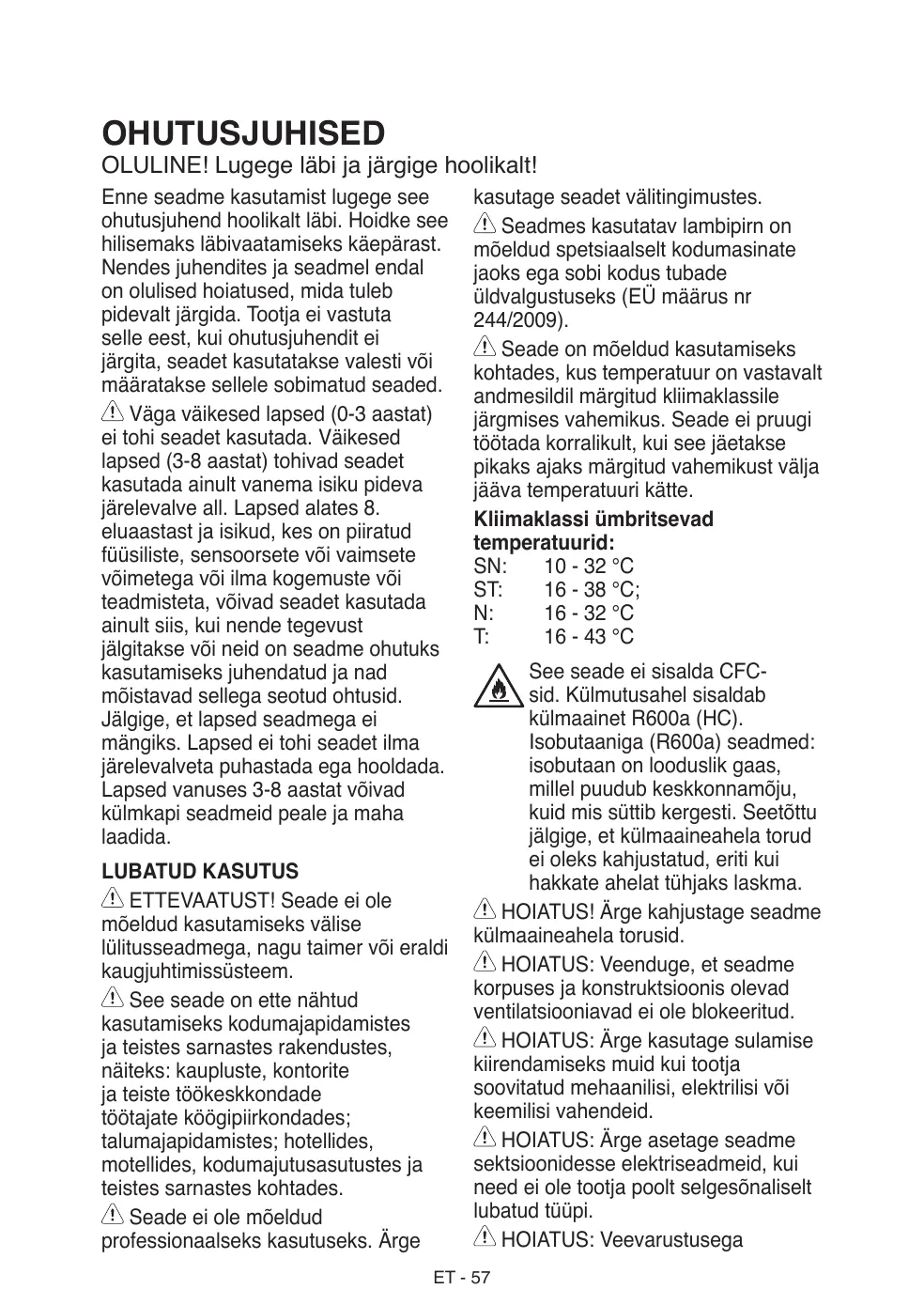 kasutage seadet välitingimustes. Seadmes kasutatav lambipirn on mõeldud spetsiaalselt kodumasinate jaoks ega sobi kodus tubade üldvalgustuseks (EÜ määrus nr 244/2009). Seade on mõeldud kasutamiseks kohtades, kus temperatuur on vastavalt andmesildil märgitud kliimaklassile järgmises vahemikus. Seade ei pruugi töötada korralikult, kui see jäetakse pikaks ajaks märgitud vahemikust välja jääva temperatuuri kätte. Kliimaklassi ümbritsevad temperatuurid: SN: 10 - 32 °C ST: 16 - 38 °C; N: 16 - 32 °C T: 16 - 43 °C See seade ei sisalda CFCsid. Külmutusahel sisaldab külmaainet R600a (HC). Isobutaaniga (R600a) seadmed: isobutaan on looduslik gaas, millel puudub keskkonnamõju, kuid mis süttib kergesti. Seetõttu jälgige, et külmaaineahela torud ei oleks kahjustatud, eriti kui hakkate ahelat tühjaks laskma. HOIATUS! Ärge kahjustage seadme külmaaineahela torusid. HOIATUS: Veenduge, et seadme korpuses ja konstruktsioonis olevad ventilatsiooniavad ei ole blokeeritud. HOIATUS: Ärge kasutage sulamise kiirendamiseks muid kui tootja soovitatud mehaanilisi, elektrilisi või keemilisi vahendeid. HOIATUS: Ärge asetage seadme sektsioonidesse elektriseadmeid, kui need ei ole tootja poolt selgesõnaliselt lubatud tüüpi. HOIATUS: Veevarustusega