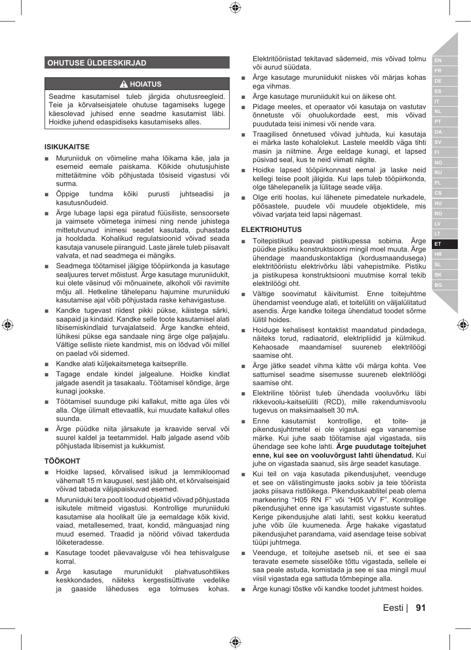 Enne seadmega töö alustamist lugege kõik juhised hoolikalt läbi ja pidage kinni hoiatustest ja ohutusega seotud juhistest. Kandke kuulmiskaitsevahendeid Kandke silmakaitsevahendeid Euraasia vastavusmärk.