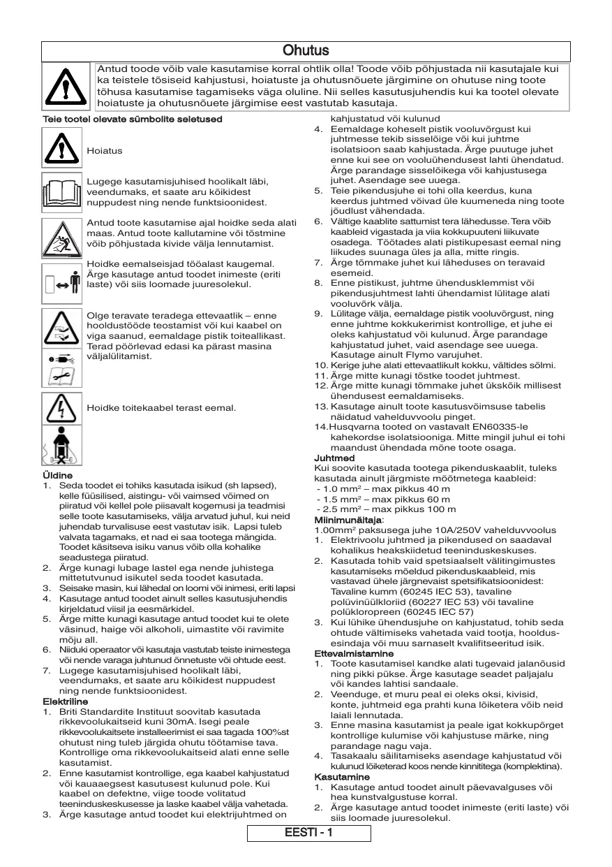 näidatud vahelduvvoolu pinget. 14.Husqvarna tooted on vastavalt EN60335-le kahekordse isolatsiooniga. Mitte mingil juhul ei tohi maandust ühendada mõne toote osaga. Juhtmed Kui soovite kasutada tootega pikenduskaablit, tuleks kasutada ainult järgmiste mõõtmetega kaableid: - 1.0 mm2 – max pikkus 40 m - 1.5 mm2 – max pikkus 60 m - 2.5 mm2 – max pikkus 100 m Miinimunäitaja: 1.00mm2 paksusega juhe 10A/250V vahelduvvoolus