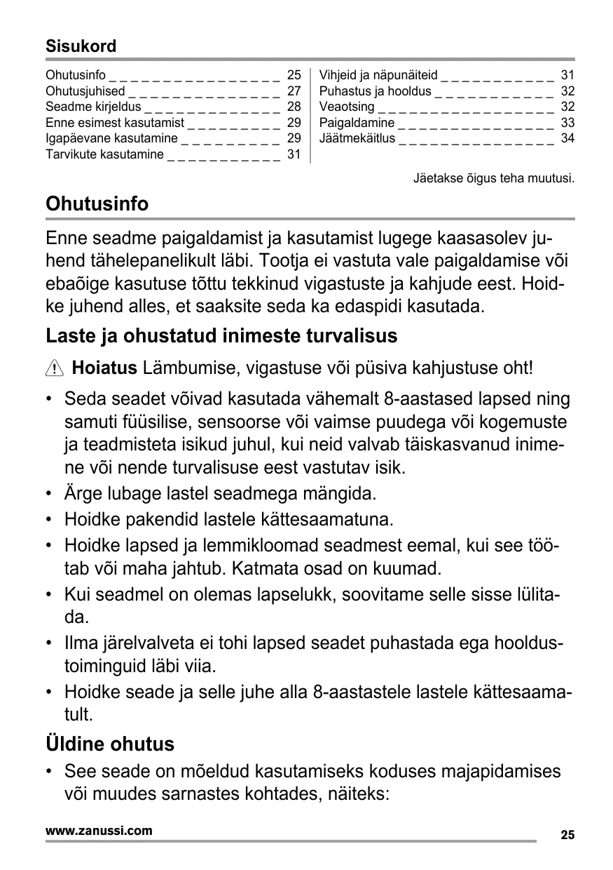 • Seadet tuleb regulaarselt puhastada ja toidujäägid eemaldada. • Seadme ebapuhtana hoidmine võib kaasa tuua pinna kahjustumise, mis võib seadme kasutusiga vähendada ja tekitada ohtlikke olukordi. • Järgige kindlasti kapile ette nähtud minimaalseid mõõtmeid (kui need on antud). Vt jaotist "Paigaldamine". • Seadme kasutamise ajal peab väline katteuks olema lahti (kui see on olemas). • Ärge kasutage ukseklaasi puhastamiseks karedaid, abrasiivseid puhasteid ega teravaid metallist kaabitsaid, sest need võivad klaasi pinda kriimustada, mille tagajärjel võib klaas puruneda. • Kui toitejuhe on vigastatud, laske see ohutuse mõttes välja vahetada tootja, volitatud hooldekeskuse või lihtsalt kvalifitseeritud isiku poolt. Ohutusjuhised Paigaldamine Hoiatus Seadet tohib paigaldada ainult kvalifitseeritud elektrik! • Eemaldage kõik pakkematerjalid. • Kahjustatud seadet ei tohi paigaldada ega kasutada. • Järgige seadmega kaasas olevaid paigaldusjuhiseid. • Olge seadme teise kohta viimisel ettevaatlik, sest see on raske. Kasutage alati kaitsekindaid. • Ärge kunagi tõmmake seadet käepidemest. • Tagage minimaalne kaugus muudest seadmetest ja mööbliesemetest. • Veenduge, et seade on paigaldatud kindlate konstruktsioonide alla ja kõrvale. • Seadme küljed peavad jääma vastu teiste sama kõrgusega seadmete külgi. Elektriühendus Hoiatus Tulekahju- ja elektrilöögioht! www.zanussi.com