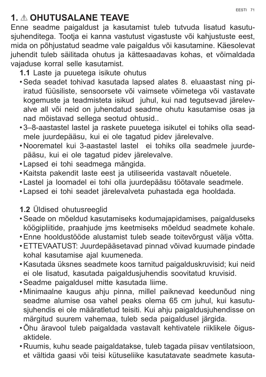 Kasutage alati originaalvaruosi. Volitatud hoolduskeskusega ühendust võttes veenduge, et teil on saadaval järgmised andmed: mudel, PNC, seerianumber. Selle teabe leiate nimiandmete plaadilt. Hoiatus / Ettevaatust - Ohutusteave Üldine teave ja nõuanded Keskkonnateave Käesolevat dokumenti võidakse ette teatamata muuta. EESTI 71