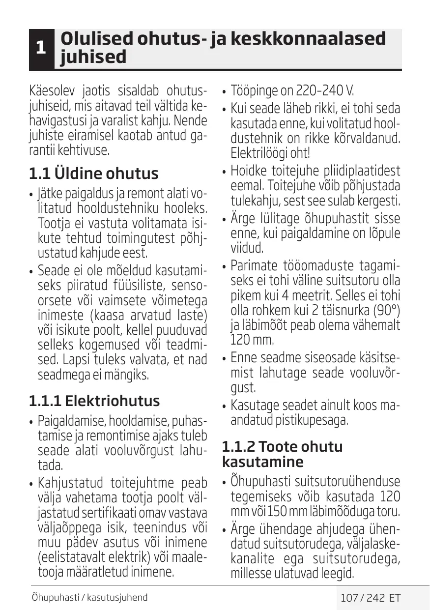 sutamiseks ainult koduses majapidamises. See ei sobi kommertskasutuseks ja seda ei tohi kasutada muuks kui ettenähtud otstarbeks. •• Tootja ei võta mingit vastutust väära kasutamise või käsitsemise tagajärjel tekkinud kahjude eest. •• Toote eluiga on 10 aastat. See on aeg, mille jooksul peavad saadaval olema toote nõuetekohaseks toimimiseks vajalikud varuosad. •• HOIATUS! Kui kruvide paigaldamisel eiratakse juhendis esitatud juhiseid, võib tekkida elektrilöögi oht. 109 / 242 ET