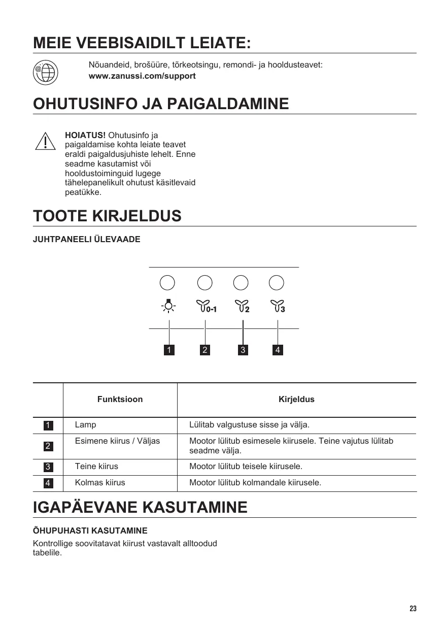 Nous vous recommandons de laisser la hotte fonctionner pendant environ 15 minutes après la cuisson. Pour utiliser la hotte : 1. Appuyez sur la touche de la première vitesse pour allumer l’appareil. 2. Si nécessaire, modifiez la vitesse en appuyant sur la touche souhaitée.
