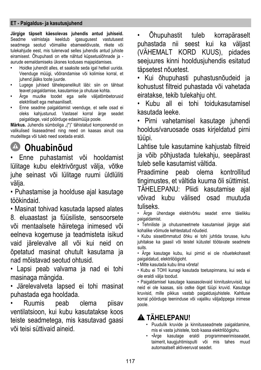 • Para la sustitución de la lámpara sólo utilizar el tipo de lámpara indicado en la sección de mantenimiento/sustitución de este manual. El uso de una llama libre es perjudicial para los filtros y puede provocar incendios, por lo tanto, debe evitarse en cualquier caso. Los fritos debe realizarse con cuidado para evitar que el aceite caliente prenda fuego. ATENCIÓN: Cuando la placa de cocción está funcionando las partes accesibles de la campana pueden calentarse.