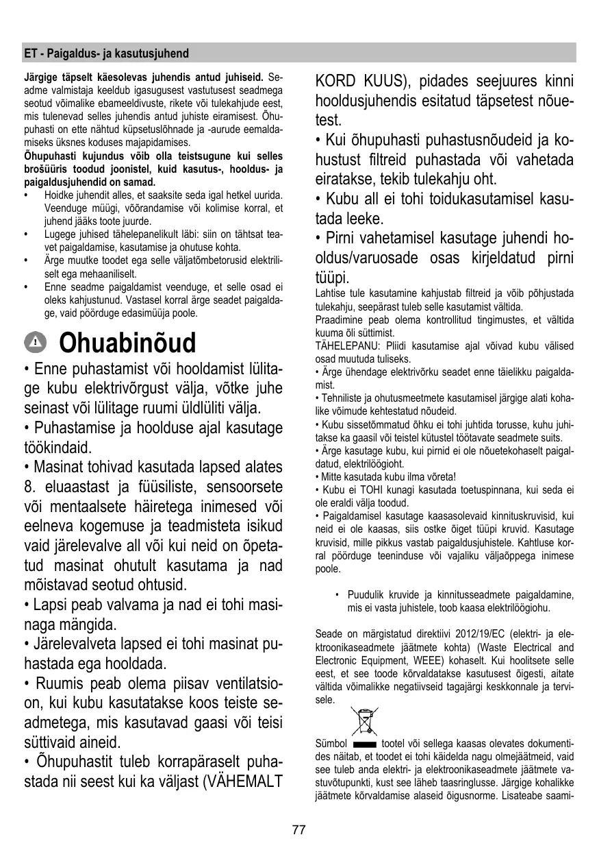 - Ruumis peab olema piisav ventilatsioon, kui kubu kasutatakse koos teiste seadmetega, mis kasutavad gaasi või teisi süttivaid aineid.