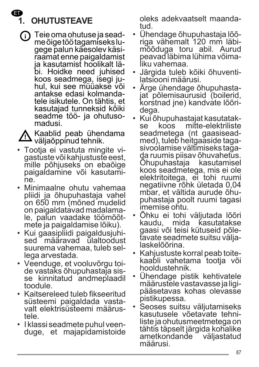 Teie oma ohutuse ja seadme õige töö tagamiseks lugege palun käesolev käsiraamat enne paigaldamist ja kasutamist hoolikalt läbi. Hoidke need juhised koos seadmega, isegi juhul, kui see müüakse või antakse edasi kolmandatele isikutele. On tähtis, et kasutajad tunneksid kõiki seadme töö- ja ohutusomadusi. Kaablid peab ühendama väljaõppinud tehnik. Tootja ei vastuta mingite vigastuste või kahjustuste eest, mille põhjuseks on ebaõige paigaldamine või kasutamine. Minimaalne ohutu vahemaa pliidi ja õhupuhastaja vahel on 650 mm (mõned mudelid on paigaldatavad madalamale, palun vaadake töömõõtmete ja paigaldamise lõiku). Kui gaasipliidi paigaldusjuhised määravad ülaltoodust suurema vahemaa, tuleb sellega arvestada. Veenduge, et vooluvõrgu toide vastaks õhupuhastaja sisse kinnitatud andmeplaadil toodule. Kaitsereleed tuleb fikseeritud süsteemi paigaldada vastavalt elektrisüsteemi määrustele. I klassi seadmete puhul veenduge, et majapidamistoide