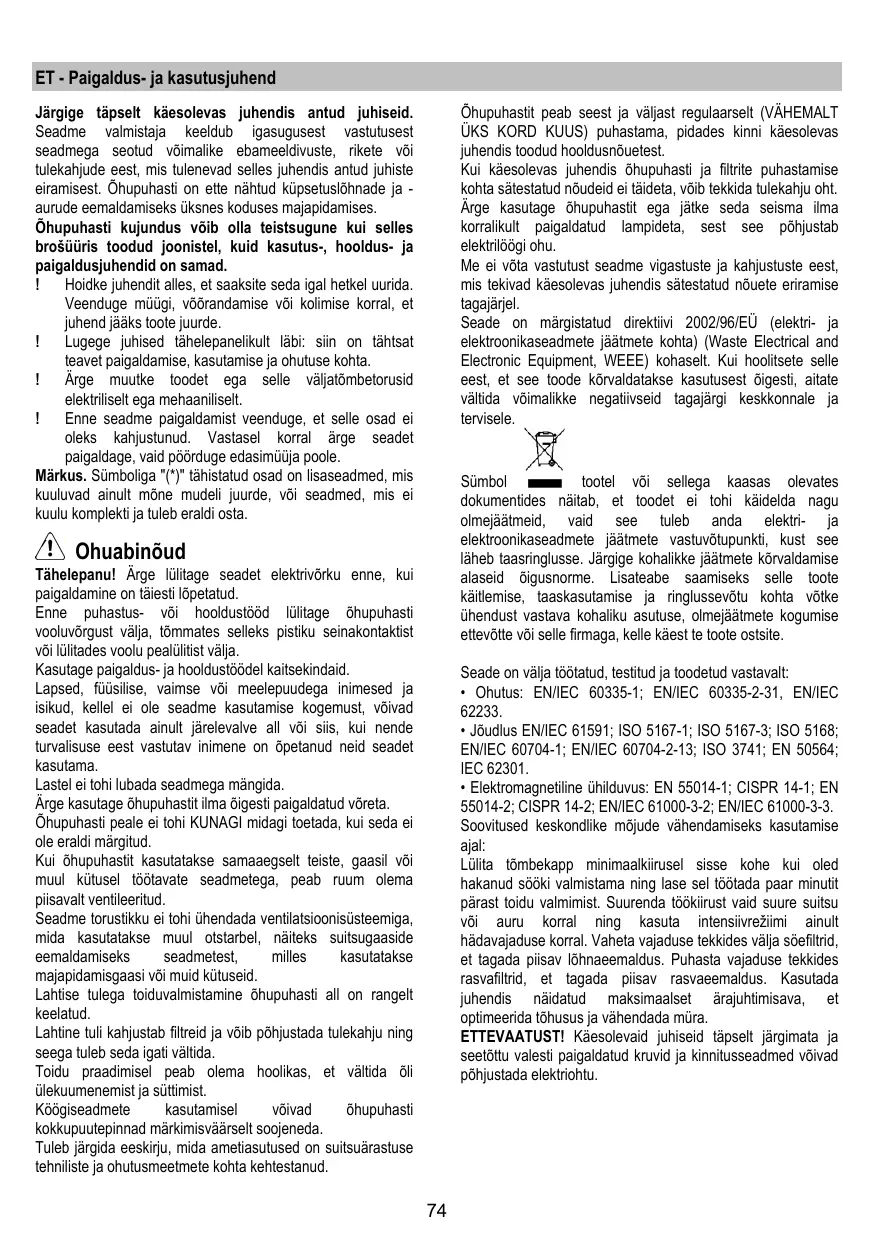 Järgige tapselt kæsolevas juhendis antud juhiseid. Seadme valmistaja keeldub igasugusest vastutusest seadmega seotud voimalike ebameeldivuste, rikete vio tulekahjude eest, mis tulenevad selles juhendis antud juhe ieramiset. Ohupuhasti on ette nàhtud kūpsetuslohnade ja -aurude eemaldamiseks uksnes koduses majapidamises.