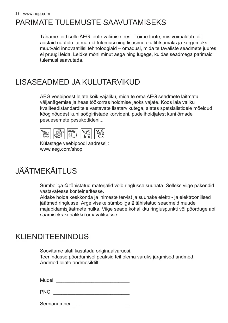 AEG veebipoest leiate kõik vajaliku, mida te oma AEG seadmete laitmatu väljanägemise ja heas töökorras hoidmise jaoks vajate. Koos laia valiku kvaliteedistandarditele vastavate lisatarvikutega, alates spetsialistidele mõeldud kööginõudest kuni söögiriistade korvideni, pudelihoidjatest kuni õrnade pesuesemete pesukottideni... Külastage veebipoodi aadressil: www.aeg.com/shop