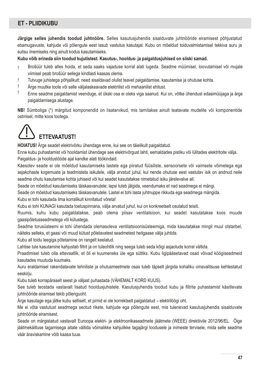 ET - PLIIDIKUBU Järgige selles juhendis toodud juhtnööre. Selles kasutusjuhendis sisalduvate juhtnööride eiramisest põhjustatud ebamugavuste, kahjude või põlengute eest lasub vastutus kasutajal. Kubu on mõeldud toiduvalmistamisel tekkiva auru ja suitsu imemiseks ning ainult kodus kasutamiseks.