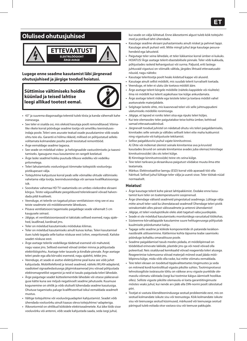 • 43" ja suurema diagonaaliga telereid tuleb tõsta ja kanda vähemalt kahe inimesega. • See teler ei sisalda osi, mis oleksid kasutaja poolt remonditavad. Võimalike rikete korral pöörduge seadme tootja või ametliku teenindusesindaja poole. Teleri sees asuvate teatud osade puudutamine võib seada ohtu teie elu. Garantii ei hõlma rikkeid, millised on põhjustatud selleks volitamata kolmandate poolte poolt teostatud remonttööd. • Ärge eemaldage seadme tagaosa. • See seade on mõeldud video- ja helisignaalide vastuvõtmiseks ja taasesitamiseks. Igasugune muu kasutamine on rangelt keelatud. • Ärge laske seadmel kokku puutuda tilkuva vedeliku või vedeliku pritsmetega. • Teleri lahutamiseks vooluvõrgust tõmmake toitepistik vooluvõrgu pistikupesast välja. • Toitejuhtme kahjustuse korral peab selle võimalike ohtude vältimiseks vahetama välja tootja, teenindusesindaja või sarnase kvalifikatsiooniga isik. • Soovitatav vahemaa HD TV vaatamiseks on umbes viiekordne ekraani kõrgus. Teiste valgusallikate peegeldused teleriekraanil võivad halvendada pildi kvaliteeti. • Veenduge, et telerile on tagatud piisav ventilatsioon ning see ei asu teiste seadmete või mööbliesemete läheduses. • Piisava ventilatsiooni tagamiseks paigaldage seade vähemalt 5 cm kaugusele seinast. • Jälgige, et ventilatsiooniavasid ei takistaks sellised esemed, nagu ajalehed, laudlinad, kardinad jms. • Teler on mõeldud kasutamiseks mõõdukas kliimas. • Teler on mõeldud kasutamiseks ainult kuivas kohas. Teleri kasutamisel õues tuleb tagada selle kaitse niiskuse eest (vihm, veepritsmed). Kaitske seadet niiskuse eest. • Ärge asetage telerile vedelikega täidetud esemeid või mahuteid, nagu vaase jms. Sellised esemed võivad ümber minna ja põhjustada elektrilöögiohtu. Asetage teler tasasele ja kindlale pinnale. Ärge asetage teleri peale ega alla kõrvalisi esemeid, nagu ajalehti, tekke jms. • Veenduge, et seade ei asetse elektrijuhtme peal kuna see võib juhet kahjustada. Mobiiltelefonid ja teised seadmed, näiteks WLAN-adapterid, raadioteel signaaliedastusega jälgimiskaamerad jms võivad põhjustada elektromagnetilist segamist ja neid ei tasuks paigutada teleri lähedale. • Ärge paigutage seadet kütteelementide lähedale või otsese päikesevalguse kätte kuna see mõjub negatiivselt seadme jahutusele. Kuumuse kogunemine on ohtlik ja võib oluliselt lühendada seadme kasutusiga. Ohutuse tagamiseks paluge kvalifitseeritud isikul eemaldada seadmelt mustus. • Vältige toitejuhtme või vooluvõrguadapteri kahjustamist. Seadet võib ühendada vooluvõrku ainult kaasas oleva toitejuhtme/-adapteriga. • Äikesetormid on ohtlikud kõikidele elektriseadmetele. Kui äike lööb sisse vooluvõrku või antenni, võib seade kahjustada saada, seda isegi juhul,