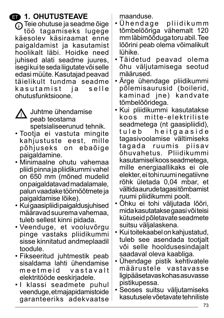 Lesdispositifsdesectionnement doivent être montés dans l’installation fixe conformément aux normes sur les systèmes de câblage. Pour les appareils de Classe I, s’assurer que l’installation électrique de votre intérieur dispose d’une mise à la terre adéquate. Reliez l’aspirateur du conduit de cheminée avec un tube ayant un diamètre minimum de 120 mm. Le parcours des fumées doit être le plus court possible. Respecter toutes les normes concernant l’évacuation de l’air. Ne reliez pas la hotte aspirante aux conduits de cheminée qui acheminent les fumées de combustion (par ex. de chaudières, de cheminées, etc.). Si vous utilisez l’aspirateur en même temps que des appareils non électriques (par ex. fonctionnant au gaz), veillez à ce que la pièce soit adéquatement ventilée, afin d’empêcher le retour du flux des gaz d’évacuation. Si vous utilisez la hotte de cuisine en même temps que des appareils non alimentés à l’électricité, la pression négative dans la pièce ne doit pas dépasser 0,04 mbar, 15