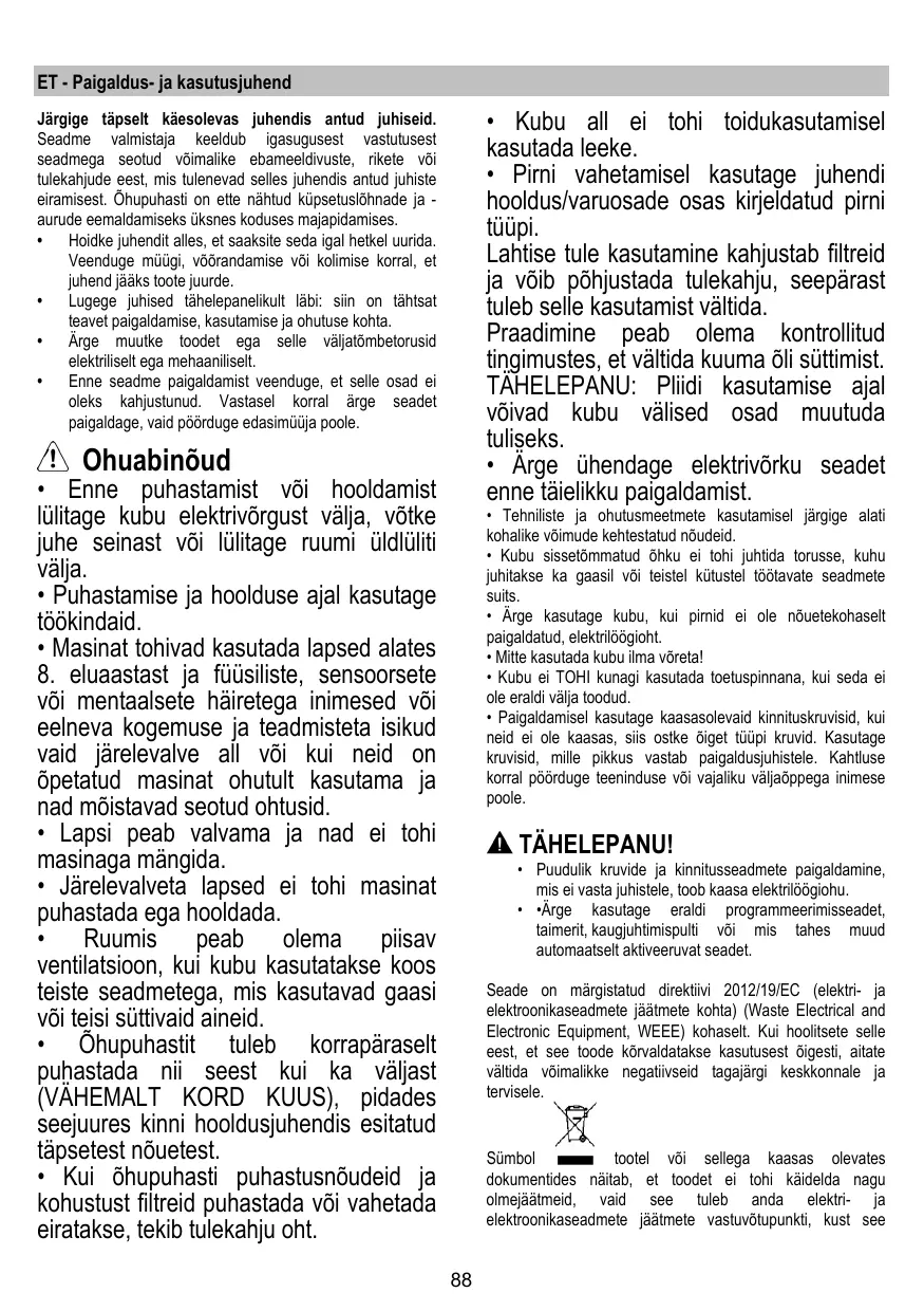 Kui ohupuhasti puhastusnõudeid ja kohustust filtreid puhastada voi vahetada eiratakse, tekib tulekahju oht.