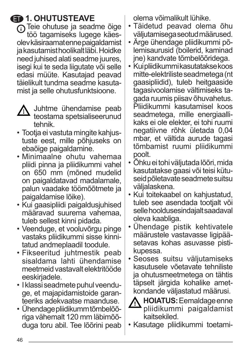 • De ruimte moet voldoende geventileerd zijn als de afzuigkap tegelijk met apparaten op gas 15