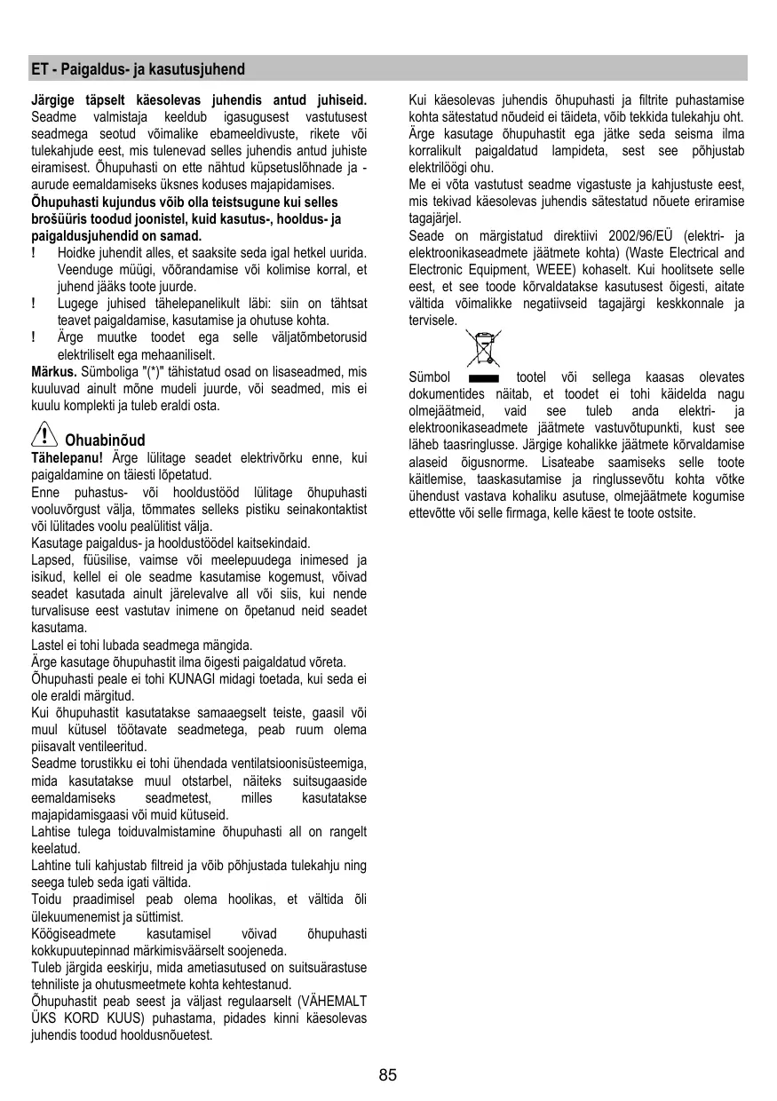 Attention! Ne pas raccorder l’appareil au circuit électrique avant que le montage ne soit complètement terminé. Avant toute opération de nettoyage ou d’entretien, débrancher la hotte du circuit électrique en retirant la prise ou en coupant l’interrupteur général de l’habitation. Munissez-vous de gants de travail avant d’effectuer toute opération d’installation et d’entretien. L’appareil n’est pas destiné à une utilisation par des enfants ou des personnes à capacités physiques, sensorielles ou mentales réduites et sans expérience et connaissance à moins qu’ils ne soient sous la supervision ou formés sur l’utilisation de l’appareil par une personne responsable de leur sécurité. Les enfants doivent être surveillés afin qu’ils ne jouent pas avec l’appareil. Ne jamais utiliser la hotte sans que la grille ne soit montée correctement! La hotte ne doit JAMAIS être utilisée comme plan pour déposer quelque chose sauf si cela est expressément indiqué. Quand la hotte est utilisée en même temps que d’autres appareils à combustion de gaz ou d’autres combustibles, le local doit disposer d’une ventilation suffisante. L’air aspiré ne doit jamais être envoyé dans un conduit utilisé pour l’évacuation des fumées produites par des appareils à combustion de gaz ou d’autres combustibles. Il est formellement interdit de faire flamber les aliments sous la hotte. L’utilisation de flammes libres peut entraîner des dégâts aux filtres et peut donner lieu à des incendies, il faut donc les éviter à tout prix.