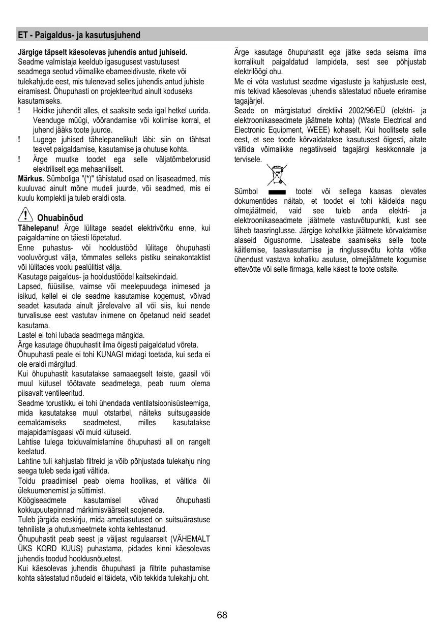 Ärge kasutage õhupuhastit ega jätke seda seisma ilma korralikult paigaldatud lampideta, sest see põhjustab elektrilöögi ohu. Me ei võta vastutust seadme vigastuste ja kahjustuste eest, mis tekivad käesolevas juhendis sätestatud nõuete eriramise tagajärjel. Seade on märgistatud direktiivi 2002/96/EÜ (elektri- ja elektroonikaseadmete jäätmete kohta) (Waste Electrical and Electronic Equipment, WEEE) kohaselt. Kui hoolitsete selle eest, et see toode kõrvaldatakse kasutusest õigesti, aitate vältida võimalikke negatiivseid tagajärgi keskkonnale ja tervisele.