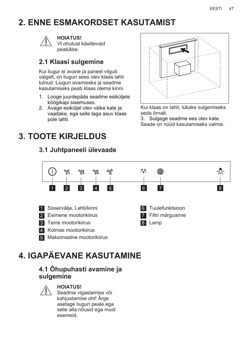 1. OHUTUSINFO JA PAIGALDAMINE HOIATUS! Ohutusinfo ja paigaldamise kohta leiate teavet eraldi paigaldusjuhiste lehelt. Enne seadme kasutamist või hooldustoiminguid lugege tähelepanelikult ohutust käsitlevaid peatükke.