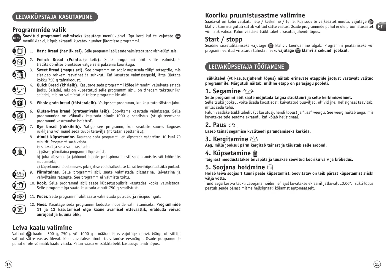 Soovitud programmi valimiseks kasutage menüüklahvi. Iga kord kui te vajutate menüüklahvi, liigub ekraanil kuvatav number järgmisse programmi. 1. Basic Bread (harilik sai). Selle programmi abil saate valmistada sandwich-tüüpi saia. 2. French Bread (Prantsuse leib). Selle programmi abil saate valmistada traditsioonilise prantsuse valge saia paksema koorikuga. 3. Sweet Bread (magus sai). See programm on sobiv nupsusaia tüüpi retseptile, mis sisaldab rohkem rasvainet ja suhkrut. Kui kasutate valmissegusid, ärge ületage kokku 750 g tainakogust. 4. Quick Bread (kiirleib). Kasutage seda programmi kõige kiiremini valmivate saiade jaoks. Saiadel, mis on küpsetatud selle programmi abil, on tihedam tekstuur kui saiadel, mis on valmistatud teiste programmide abil. 5. Whole grain bread (täisteraleib). Valige see programm, kui kasutate täisterajahu. 6. Gluten-free bread (gruteenivaba leib). Soovitame kasutada valmissegu. Selle programmiga on võimalik kasutada ainult 1000 g seadistus (vt gluteenivaba programmi kasutamise hoiatusi). 7. Rye bread (rukkileib). Valige see programm, kui kasutate suures koguses rukkijahu või muud seda tüüpi teravilja (nt tatar, speltanisu). 8. Ainult küpsetamine. Kasutage seda programmi, et küpsetada vahemikus 10 kuni 70 minutit. Programmi saab valida iseseisvalt ja seda saab kasutada: a) pärast pärmitaina programmi lõpetamist, b) juba küpsenud ja jahtunud leibade pealispinna uuesti soojendamiseks või krõbedaks muutmiseks, c) küpsetamise lõpetamiseks pikaajalise voolukatkestuse korral leivaküpsetustsükli jooksul. 9. Pärmitainas. Selle programmi abil saate valmistada pitsataina, leivataina ja vahvlitaina retsepte. See programm ei valmista toitu. 10. Kook. Selle programmi abil saate küpsetuspulbrit kasutades kooke valmistada. Selle programmiga saate kasutada ainult 750 g seadistust.