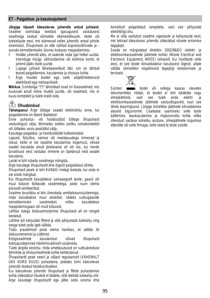 Ohuabinõud Tähelepanu! Ärge lülitage seadet elektrivõrku enne, kui paigaldamine on täiesti lõpetatud. Enne puhastus- või hooldustööd lülitage õhupuhasti vooluvõrgust välja, tõmmates selleks pistiku seinakontaktist või lülitades voolu pealülitist välja. Kasutage paigaldus- ja hooldustöödel kaitsekindaid. Lapsed, füüsilise, vaimse või meelepuudega inimesed ja isikud, kellel ei ole seadme kasutamise kogemust, võivad seadet kasutada ainult järelevalve all või siis, kui nende turvalisuse eest vastutav inimene on õpetanud neid seadet kasutama. Lastel ei tohi lubada seadmega mängida. Ärge kasutage õhupuhastit ilma õigesti paigaldatud võreta. Õhupuhasti peale ei tohi KUNAGI midagi toetada, kui seda ei ole eraldi märgitud. Kui õhupuhastit kasutatakse samaaegselt teiste, gaasil või muul kütusel töötavate seadmetega, peab ruum olema piisavalt ventileeritud. Seadme torustikku ei tohi ühendada ventilatsioonisüsteemiga, mida kasutatakse muul otstarbel, näiteks suitsugaaside eemaldamiseks seadmetest, milles kasutatakse majapidamisgaasi või muid kütuseid. Lahtise tulega toiduvalmistamine õhupuhasti all on rangelt keelatud. Lahtine tuli kahjustab filtreid ja võib põhjustada tulekahju ning seega tuleb seda igati vältida. Toidu praadimisel peab olema hoolikas, et vältida õli ülekuumenemist ja süttimist. Köögiseadmete kasutamisel võivad õhupuhasti kokkupuutepinnad märkimisväärselt soojeneda. Tuleb järgida eeskirju, mida ametiasutused on suitsuärastuse tehniliste ja ohutusmeetmete kohta kehtestanud. Õhupuhastit peab seest ja väljast regulaarselt (VÄHEMALT ÜKS KORD KUUS) puhastama, pidades kinni käesolevas juhendis toodud hooldusnõuetest. Kui käesolevas juhendis õhupuhasti ja filtrite puhastamise kohta sätestatud nõudeid ei täideta, võib tekkida tulekahju oht. Ärge kasutage õhupuhastit ega jätke seda seisma ilma